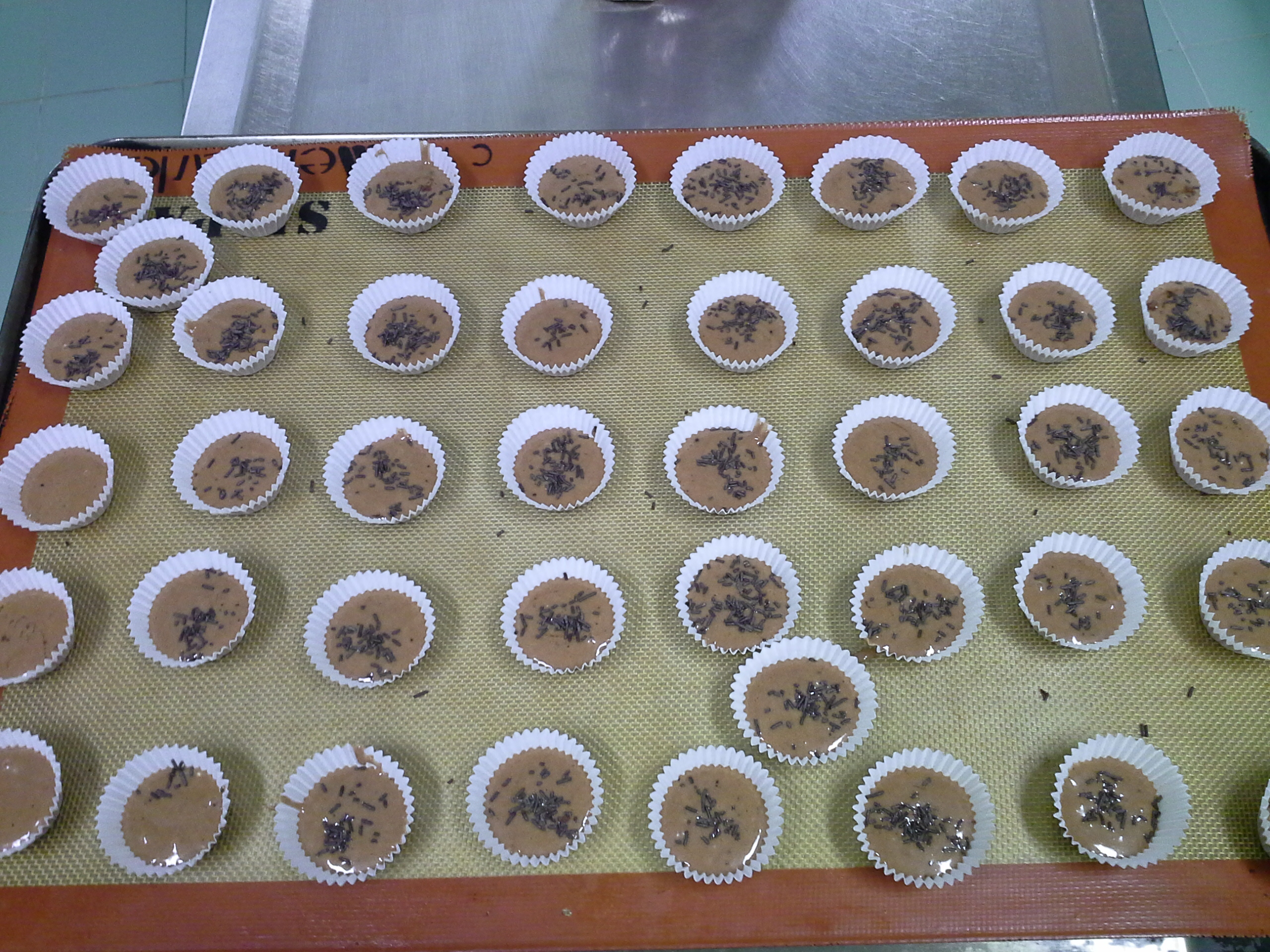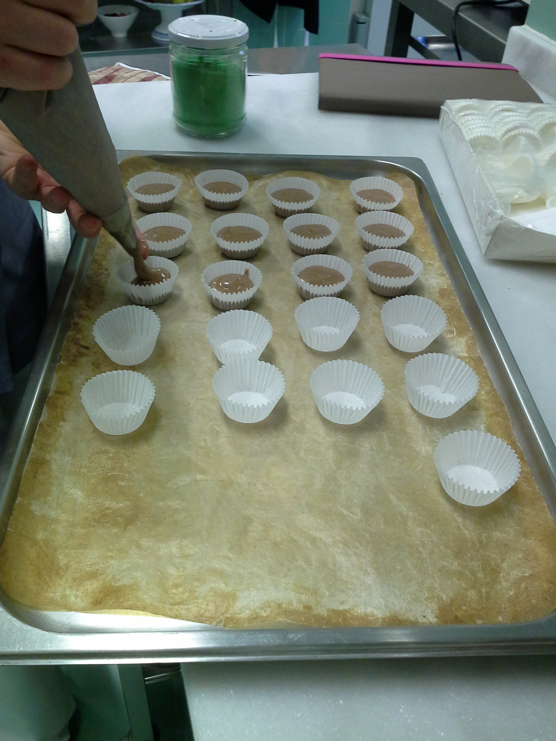 Separar la masa en diferentes boles para darle sabores…. por ejemplo si teneis esencias de sabores, echamos unas gotas de esencia de coca cola o menta, o si añadimos cacao en polvo tenemos de chocolate, (puedes hacer una degustacion y que la gente adivine los sabores) después metemos la masa en una manga pastelera con una boquilla pequeña para que sea fácil manejar y con el dedo haciendo de tope la distribuimos en las capsulas.