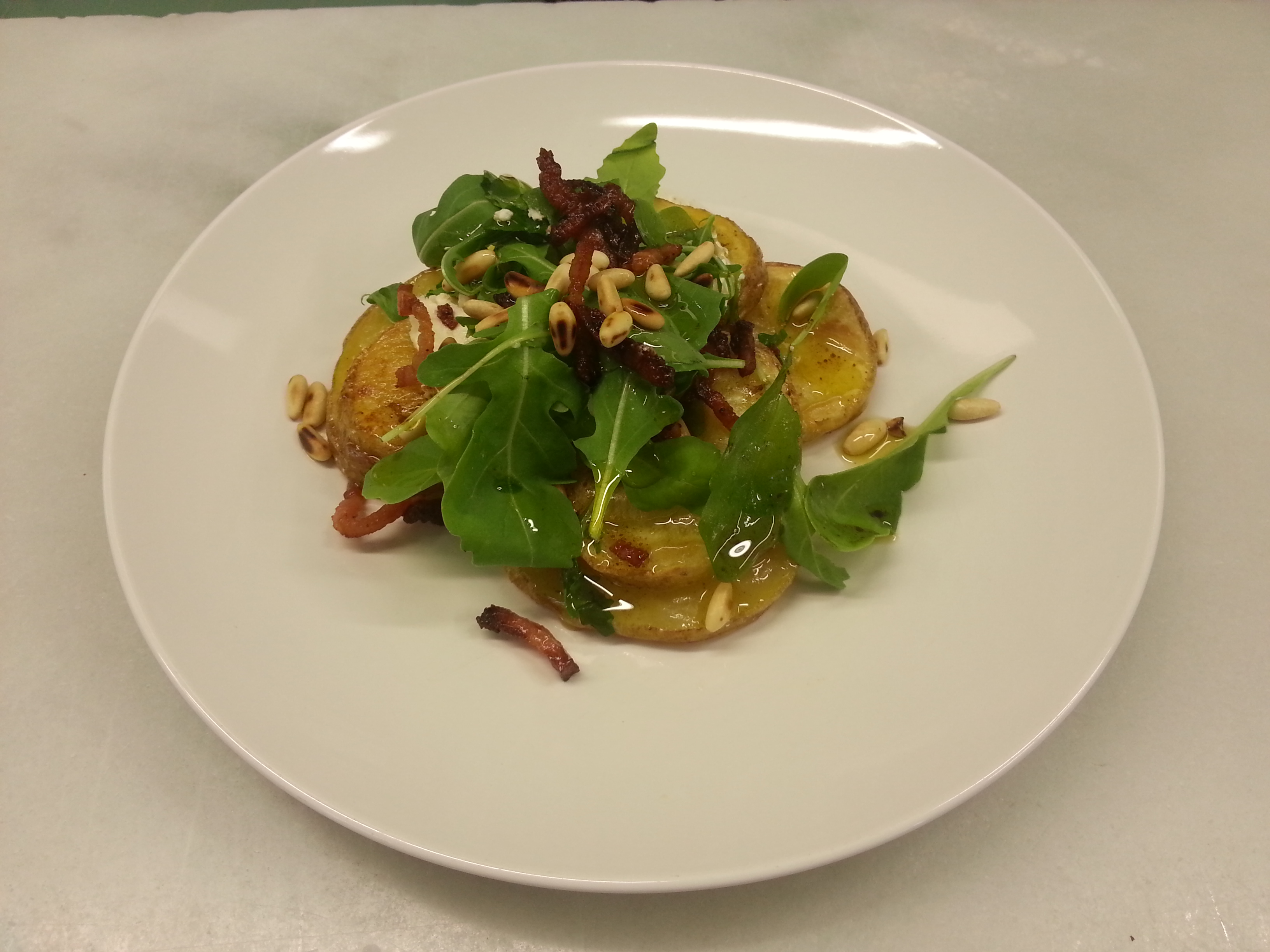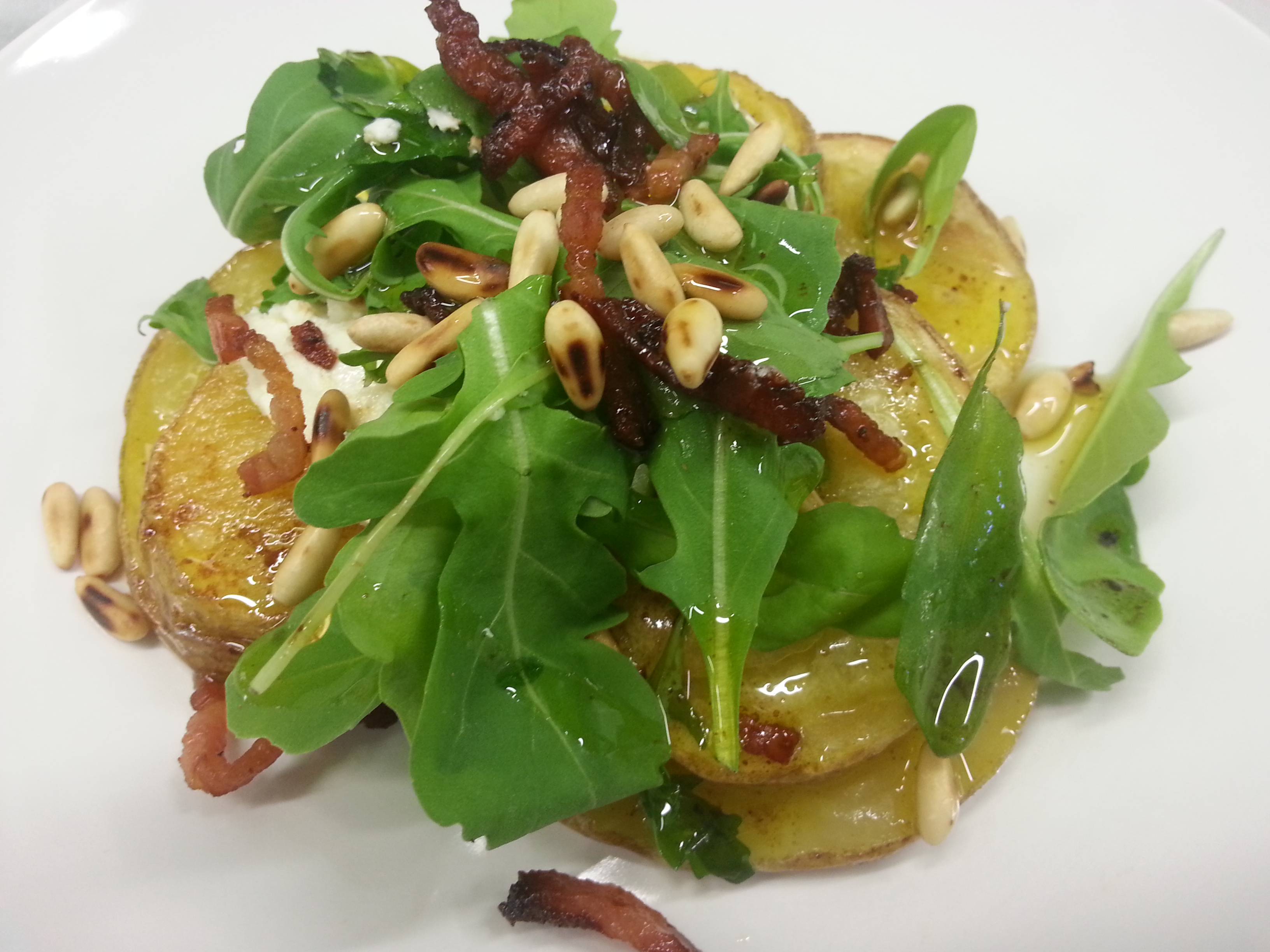 La presentación es muy simple: ponemos las patatas en el plato y encima el queso de cabra. Al estar caliente este se ira derritiendo para que cojan sabor. Y en el momento de servir el plato (antes mejor no, porque la rucula con el calor se baja), ponemos un montoncito de rucula, el bacon y los piñones. Y le damos un toque con el aliño.