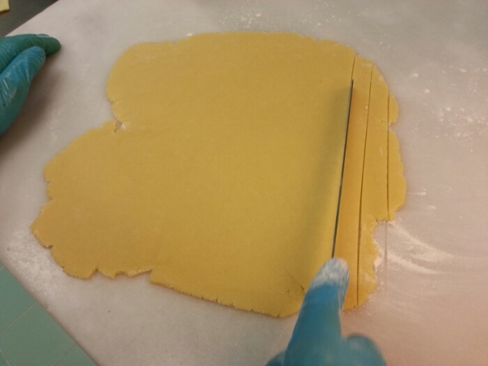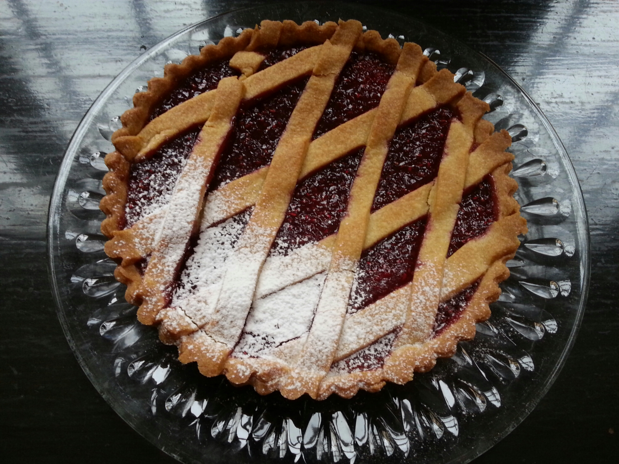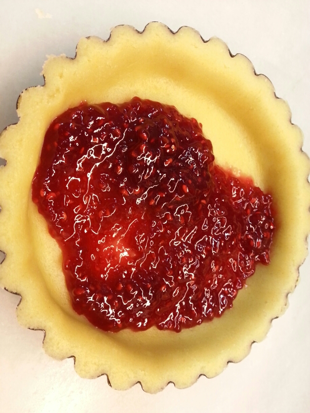 Estiramos la masa con el rodillo, como trabajamos cualquier masa quebrada, y la sobre ponemos en un molde desmoldante. Llenamos la base del molde de mermelada de frambuesa y volvemos a trabajar la masa haciendo tiras para hacer la regilla de encima.