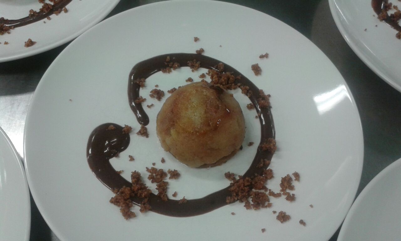 Pero hemos querido hacer un postre mas elaborado que lleva streuzel, un cremoso de chocolate; estos complementos forman parte de la decoracion.