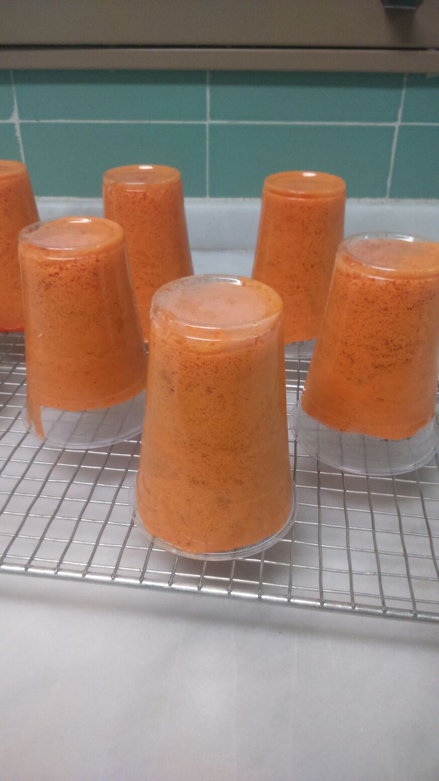 Nos preparamos vasos de plástico con unos pequeños cortes en la parte inferior y cuando está bien frío el sifón vertemos la mezcla ( no más de la mitad del vaso, pues se sufla)
