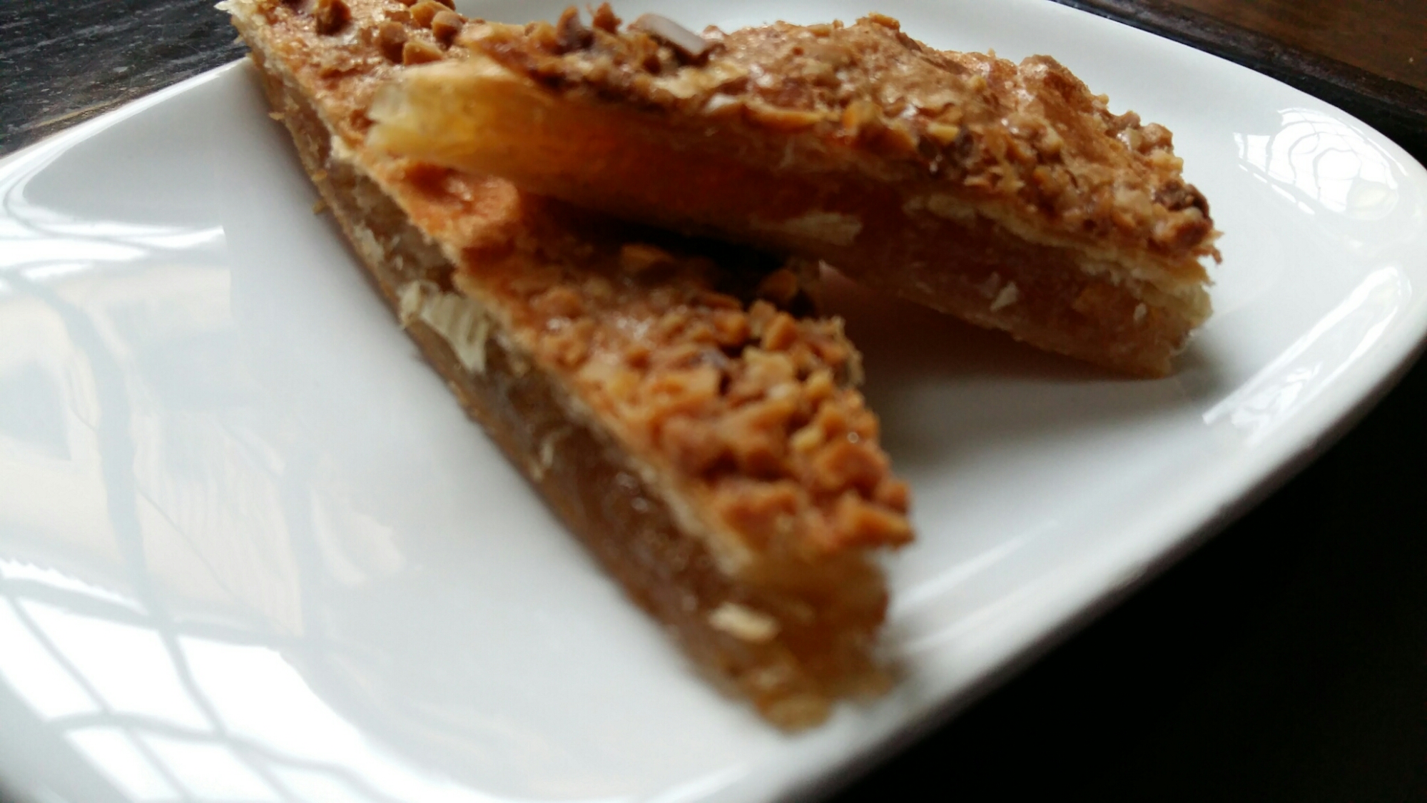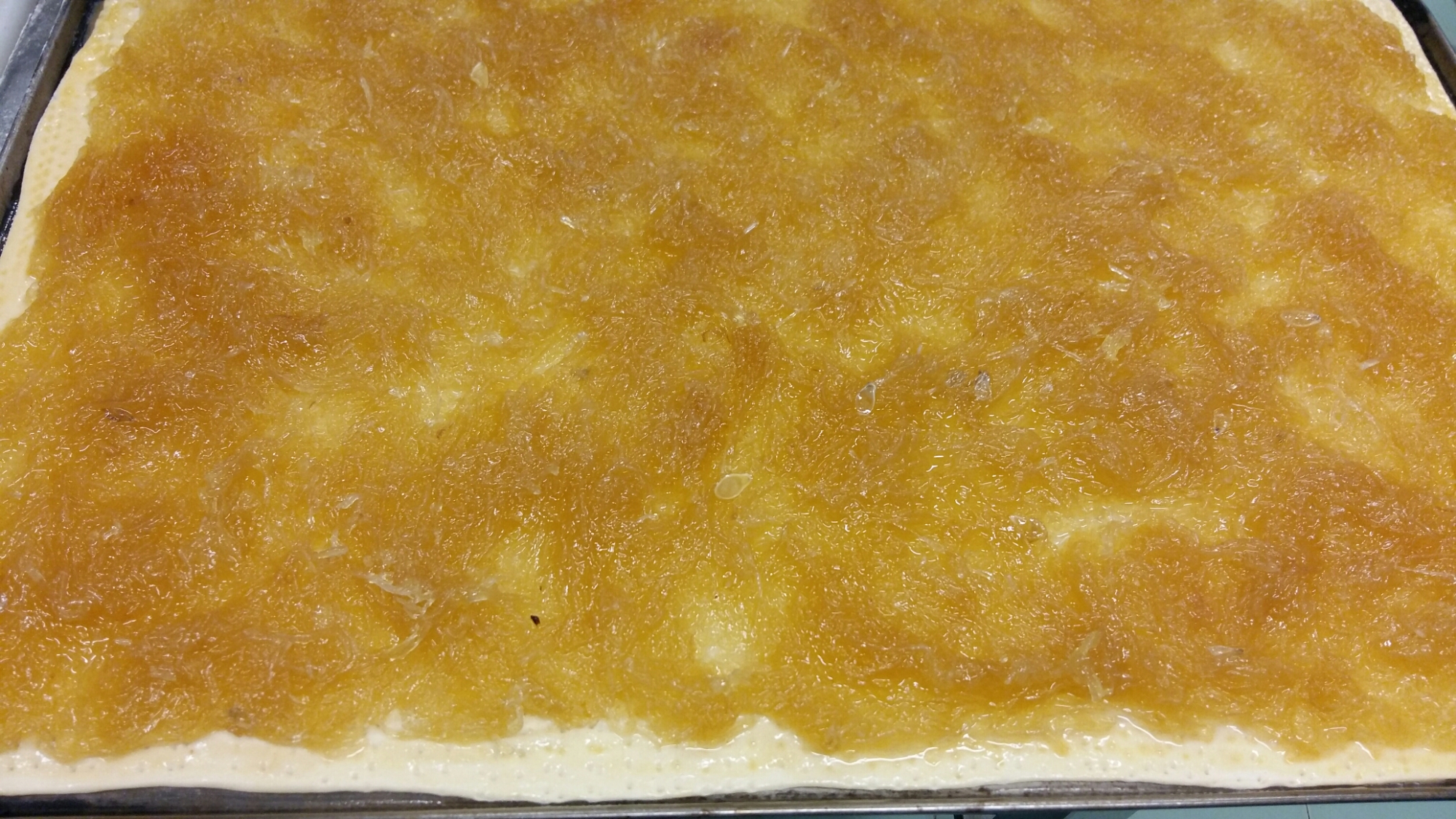 Estiramos muy bien el hojaldre y disponemos en la lata. Pinchamos por todos lados para que no crezca. Extendemos el cabello de ángel sin llegar a los laterales.