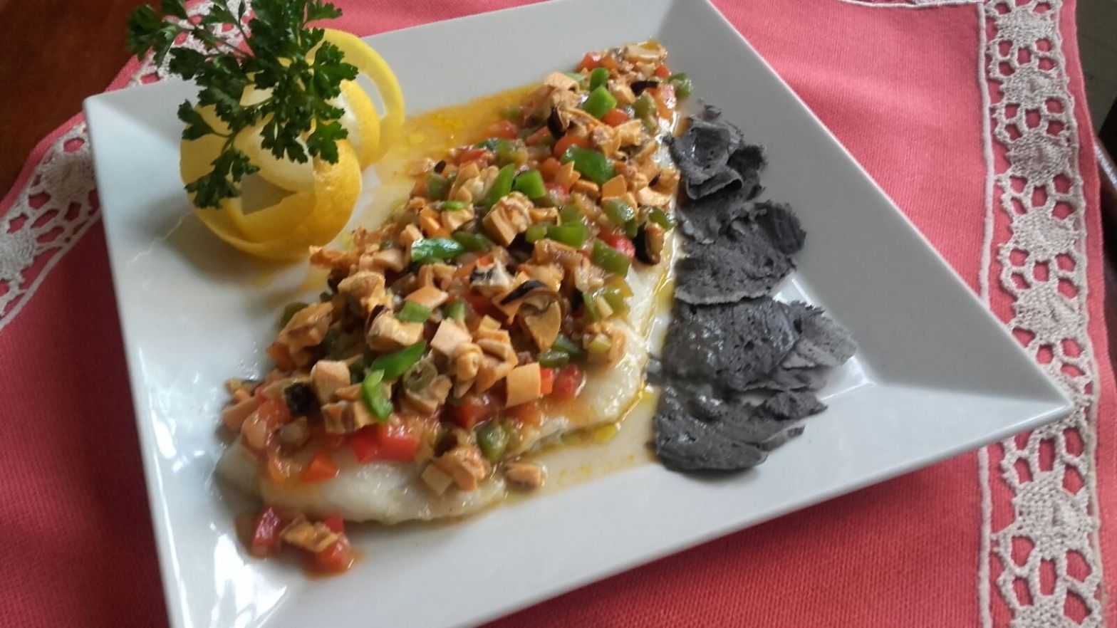 Para presentarlo podeis poner el bacalao con la salsa de mejillón debajo. Añadir el pisto y el polvo de tierra por encima.