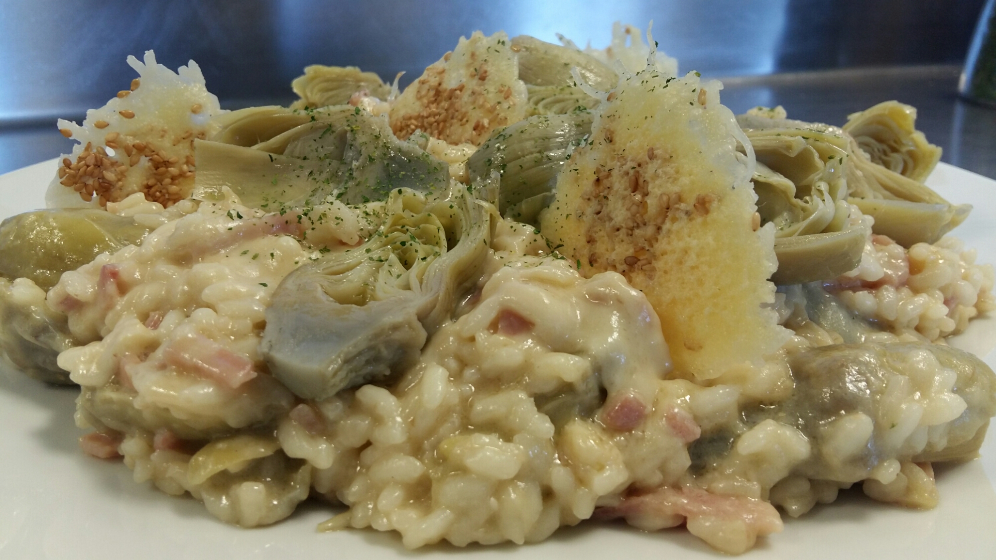 Se puede decorar con tejas de parmesano y sesamo como en la foto que es tan sencillo como poner en un plato un montoncito de queso parmesano rallado y sesamo por encima,las hacemos al microondas 1 minuto más o menos, y listo!