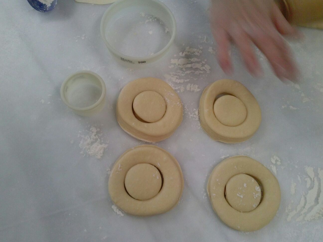 Trabajar con harina y el rodillo formando los donuts con los dos cortapastas e ir colocsndolos en una bandeja enharinada.