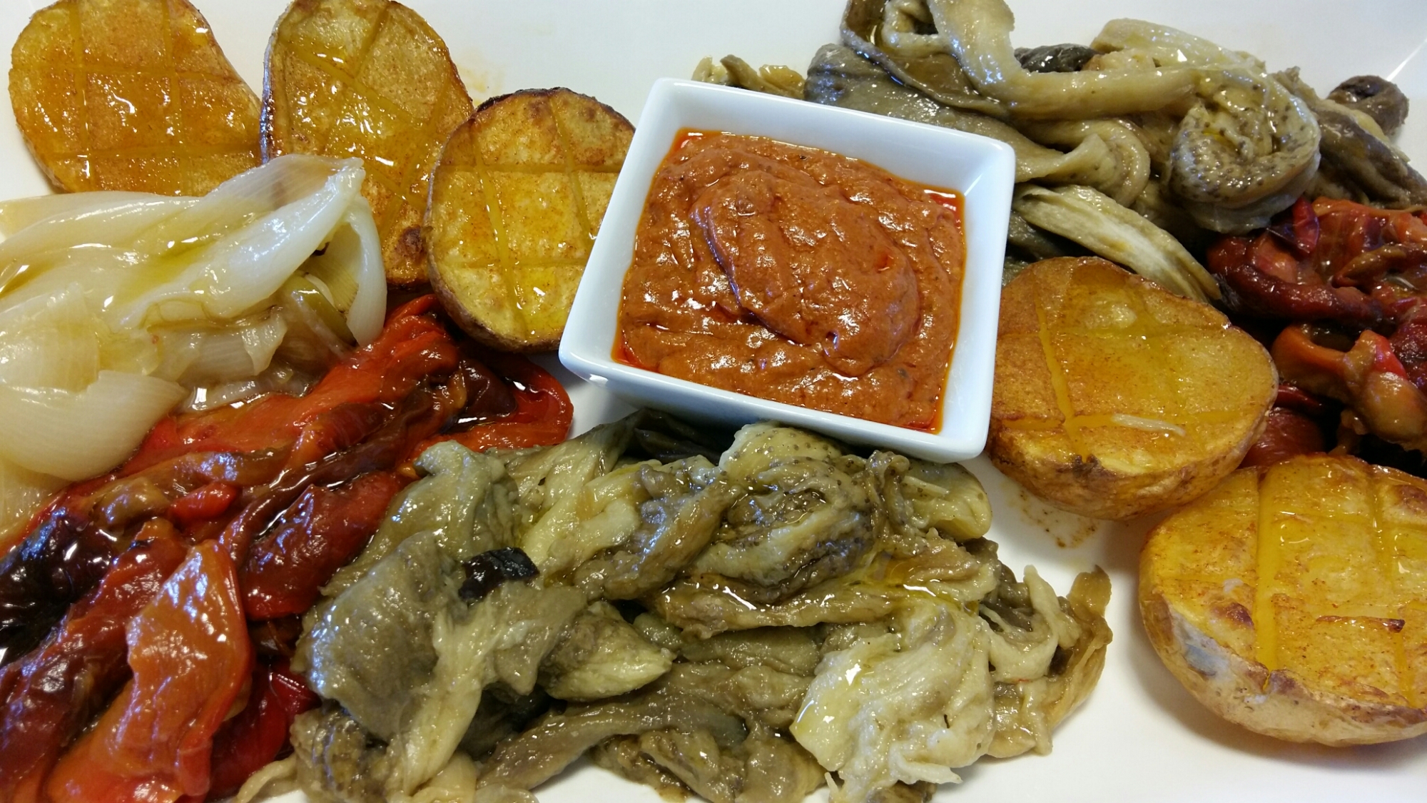 El que hoy os propongo es de primero de comida y lo vamos a enriquecer con unas patatas al horno pintadas con un aceite de pimentón y una salsa romesco.