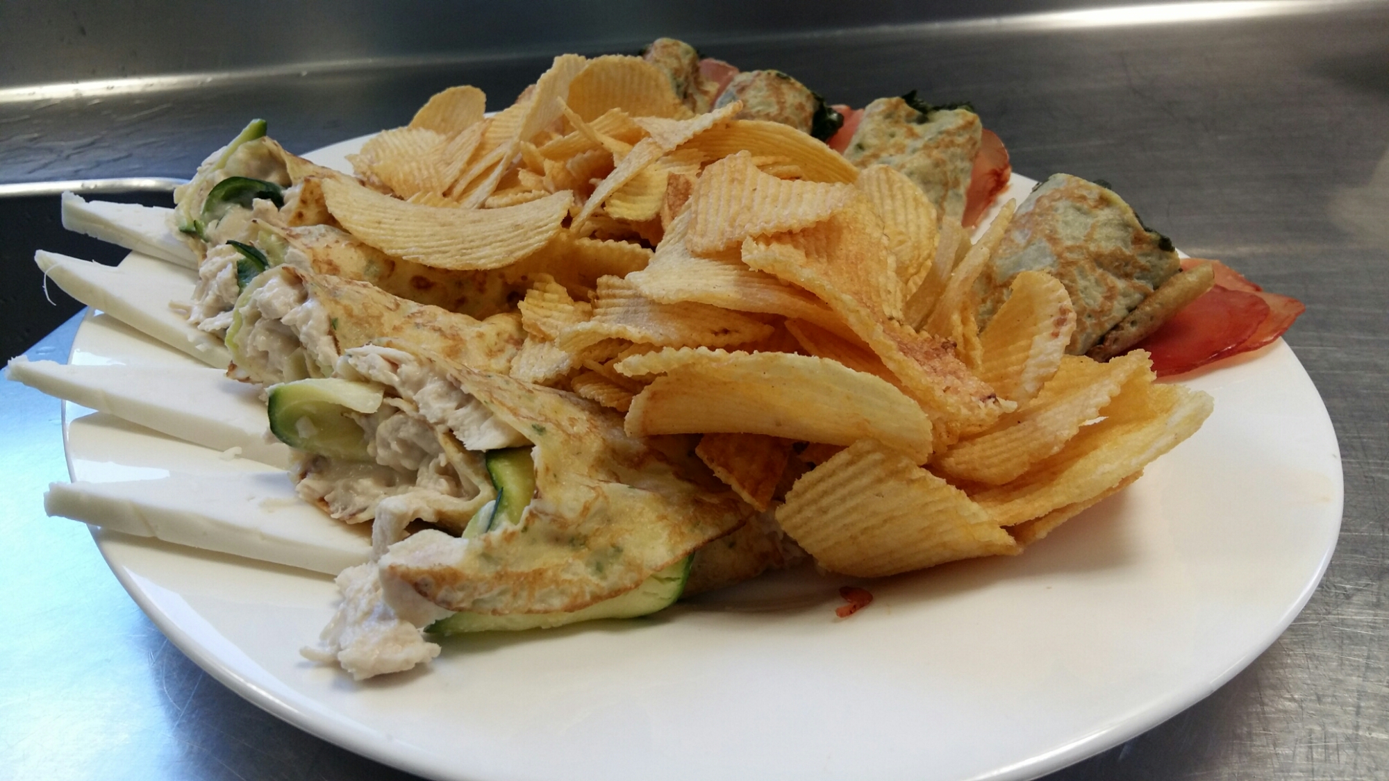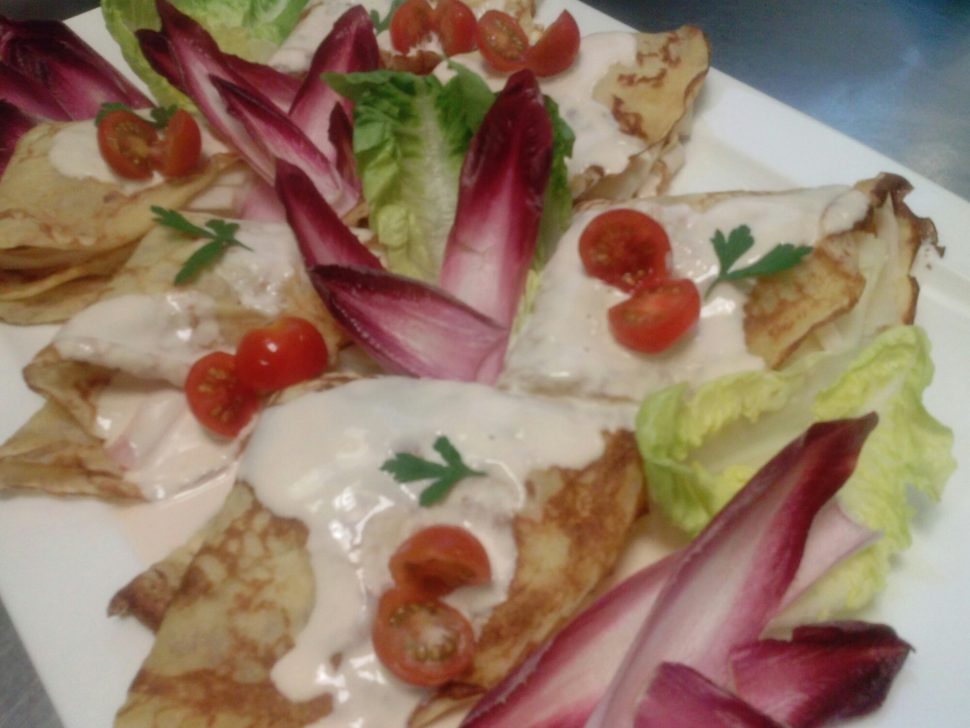 En la entrada de hoy os cuelgo una foto, nada buena por cierto, de los que presentamos el miércoles en una cena informal. Unos de ellos estan rellenos de pollo desmigado y ligado con una bechamel muy clarita y una tira de calabacín, debajo colocamos una punta de queso semicurado y la combinación era perfecta! El otro crep está relleno de espinacas ligadas igualmente con un poco de bechamel y una loncha jamón serrano, debajo aunque nose aprecia había una loncha de lomo embuchado y en el centro unas chips.