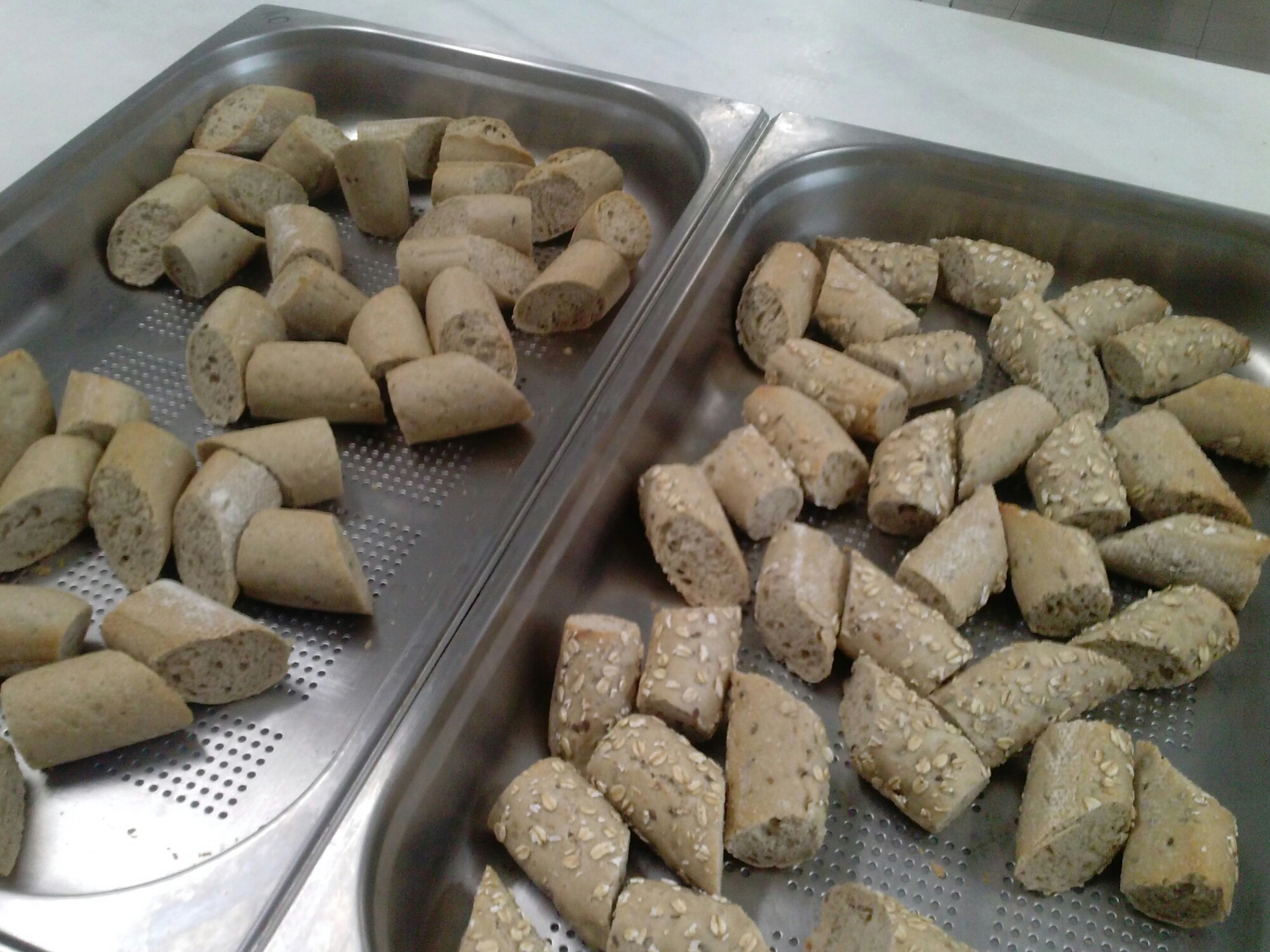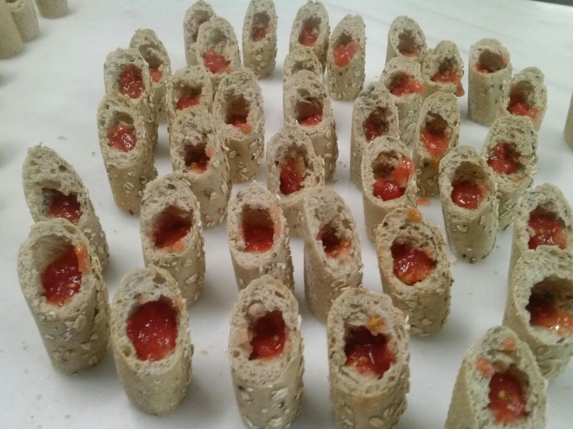 Cortaremos las puntas de la barrita (como os podéis imaginar son barras pequeñitas de un palmo de largo, ni pulguita ni baguett algo intermedio y delgadillo) de pan y haremos cortes en diagonal del tamaño y altura que mas nos guste. Con una cucharita vaciaremos un poco cada pan.