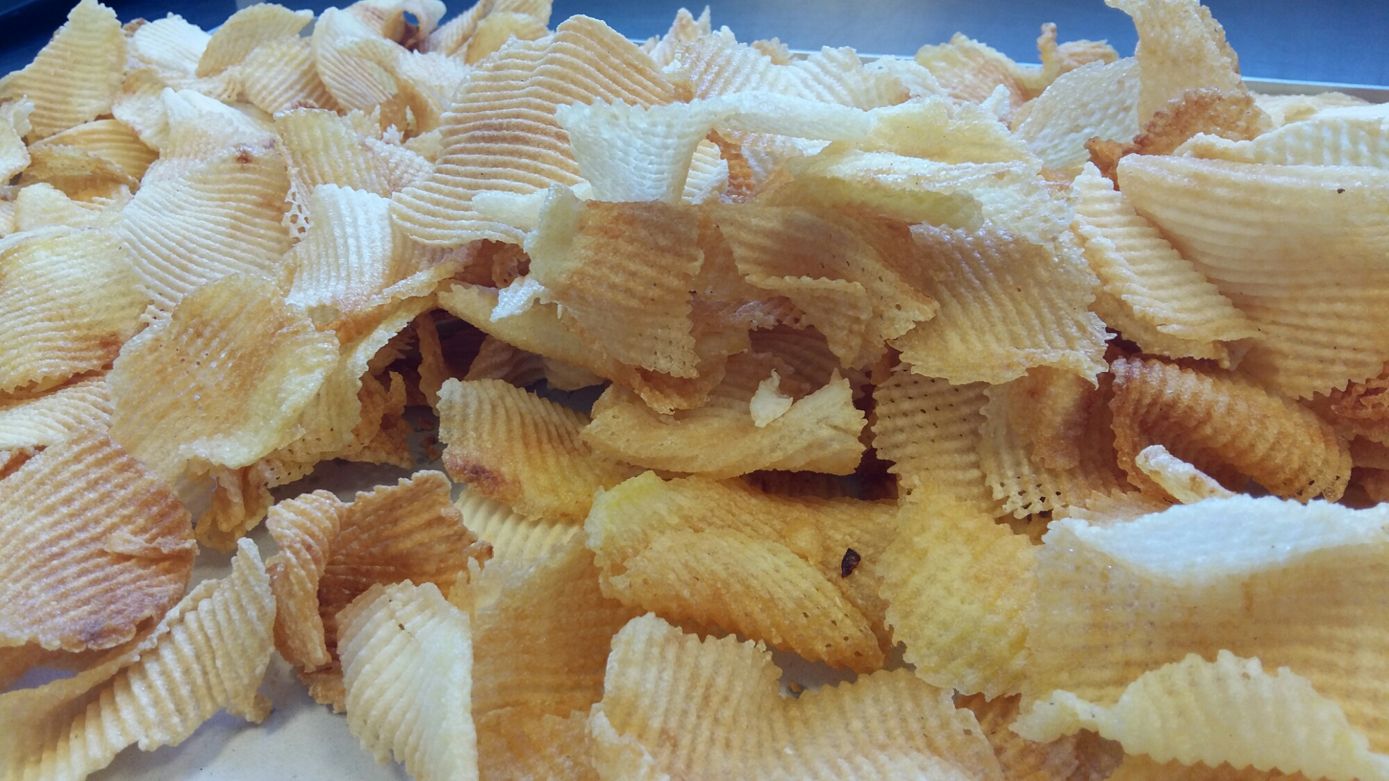 Me explico, escogemos patatas grandes, las pelamos y las cortamos con mandolina, pueden ser enrejadas o lisas, y las dejamos en remojo en agua con sal un durante un día. Las freímos en abundante aceite a 160º sin dejar de mover y en cuanto estén crujientes las sacamos a un papel absorbente para quitarle el exceso de aceite, pruébalas y veras como no necesitan mas sal.