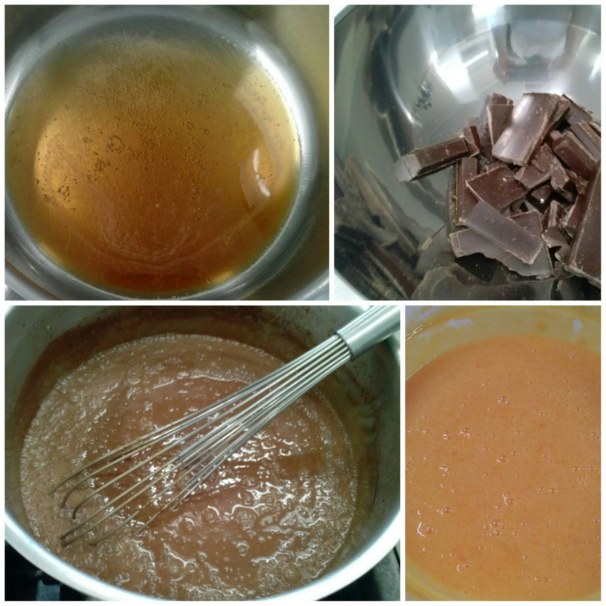 Agregamos la nata y calentamos a fuego medio, sin dejar de remover con las varillas. Incorporamos el chocolate troceado. Dejamos que cueza sin parar de remover hasta que el chocolate se haya desecho del todo.