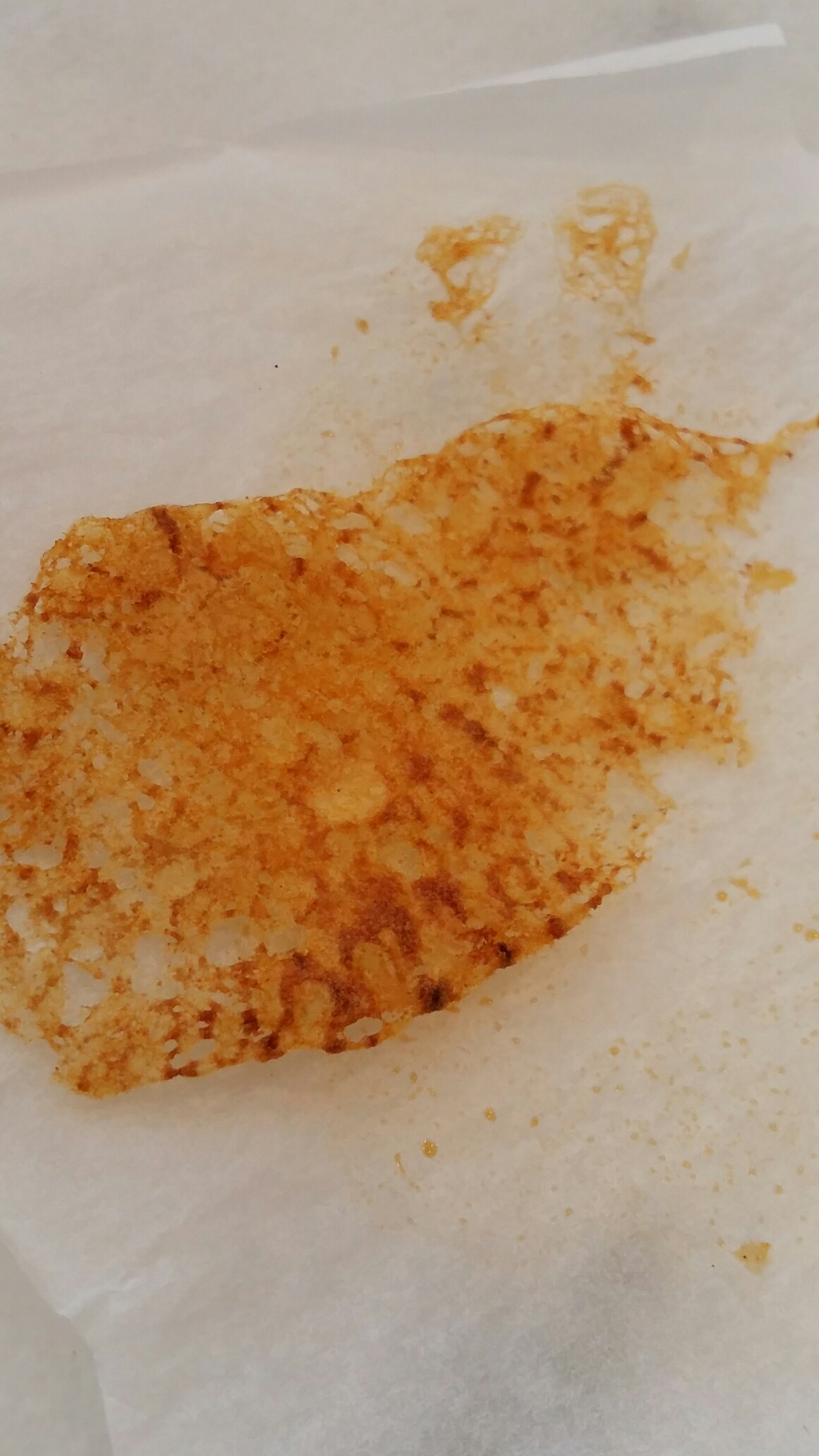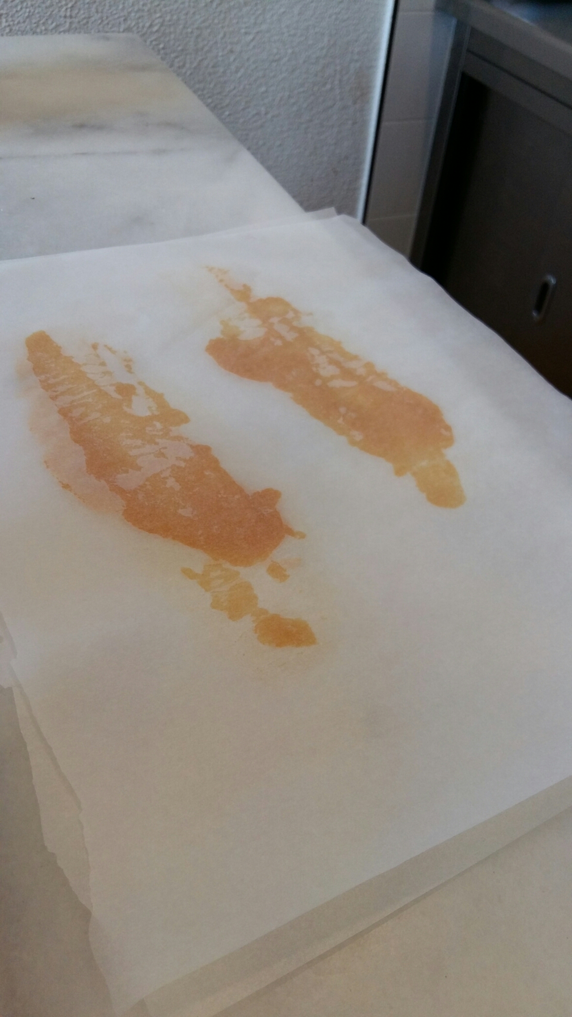 Colocar una cucharada de patatas revolconas entre dos láminas de papel sulfurizado, estirar y hornear a 50°C durante 45 minutos aproximadamente.