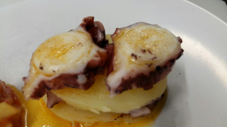 La presentación es ir montando capa de patatas con tres ruedas aproximadas de pulpo aliñado: sal gorda, pimentón y aceite.
