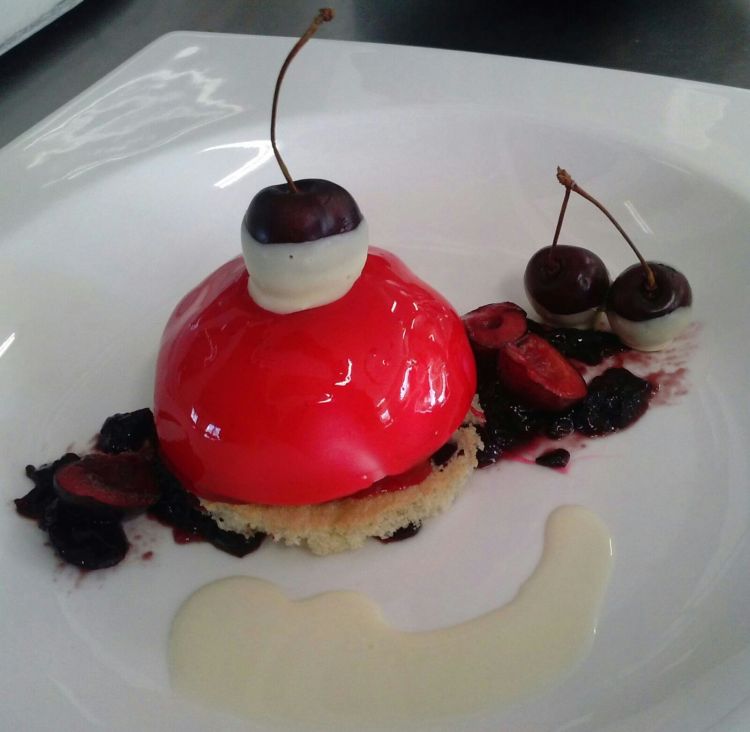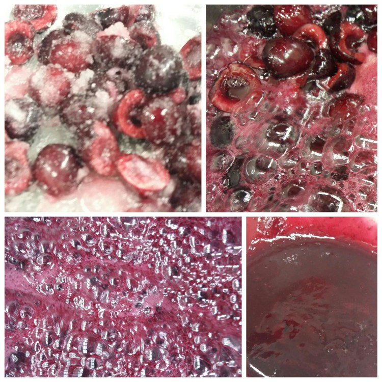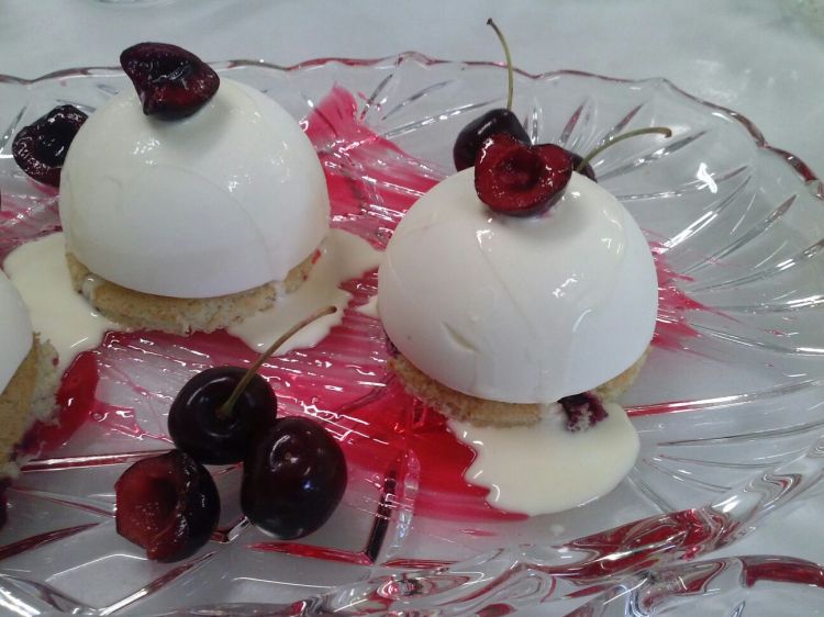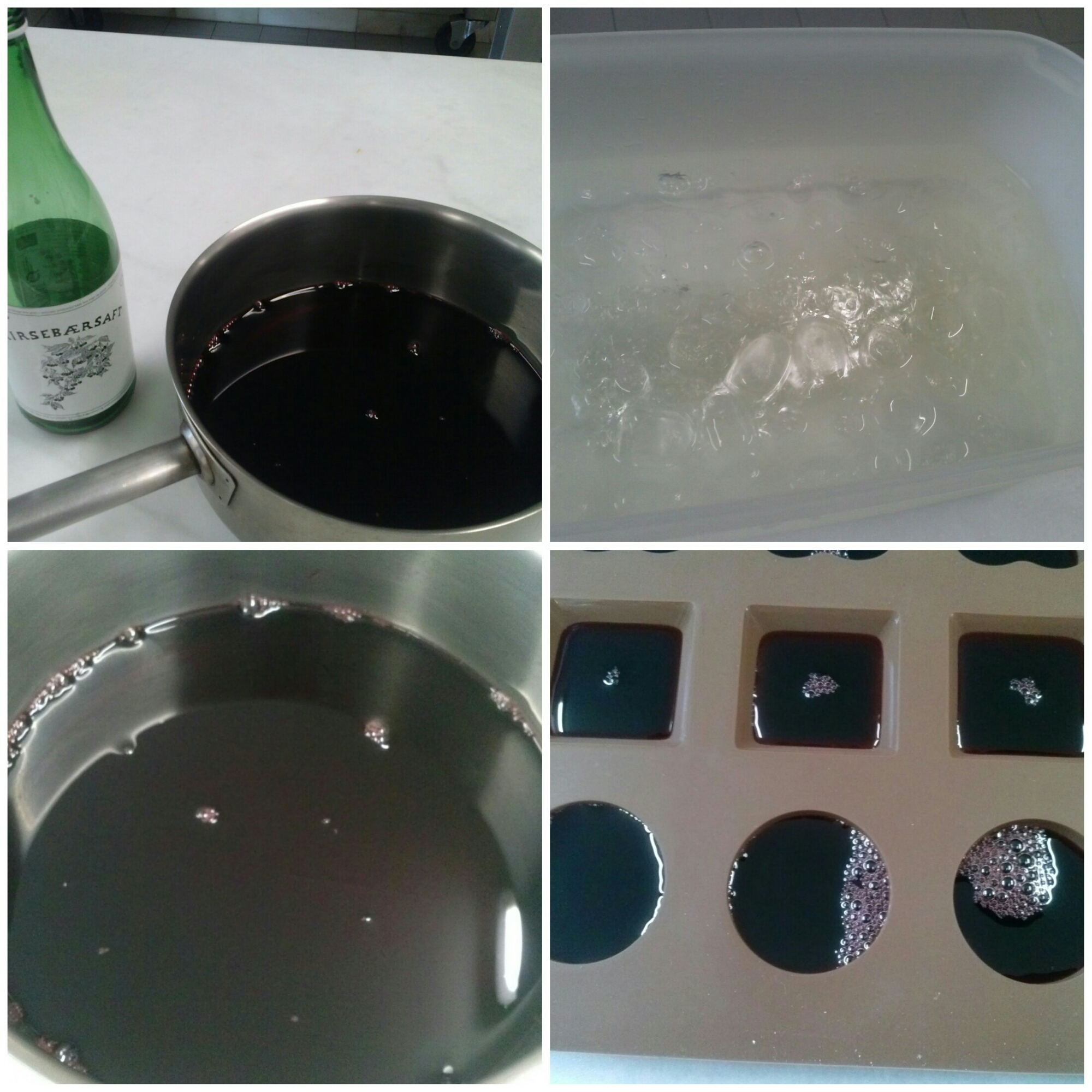 Hidratar la gelatina en agua fría. Poner al fuego el zumo de cereza y calentar. Cuando la gelatina se haya hidratado, escurrir e incorporar en el zumo de cereza caliente. Mezclar bien hasta que se disuelva del todo y verter en los moldes pequeños de semiesfera. Dejar enfriar o congelar.