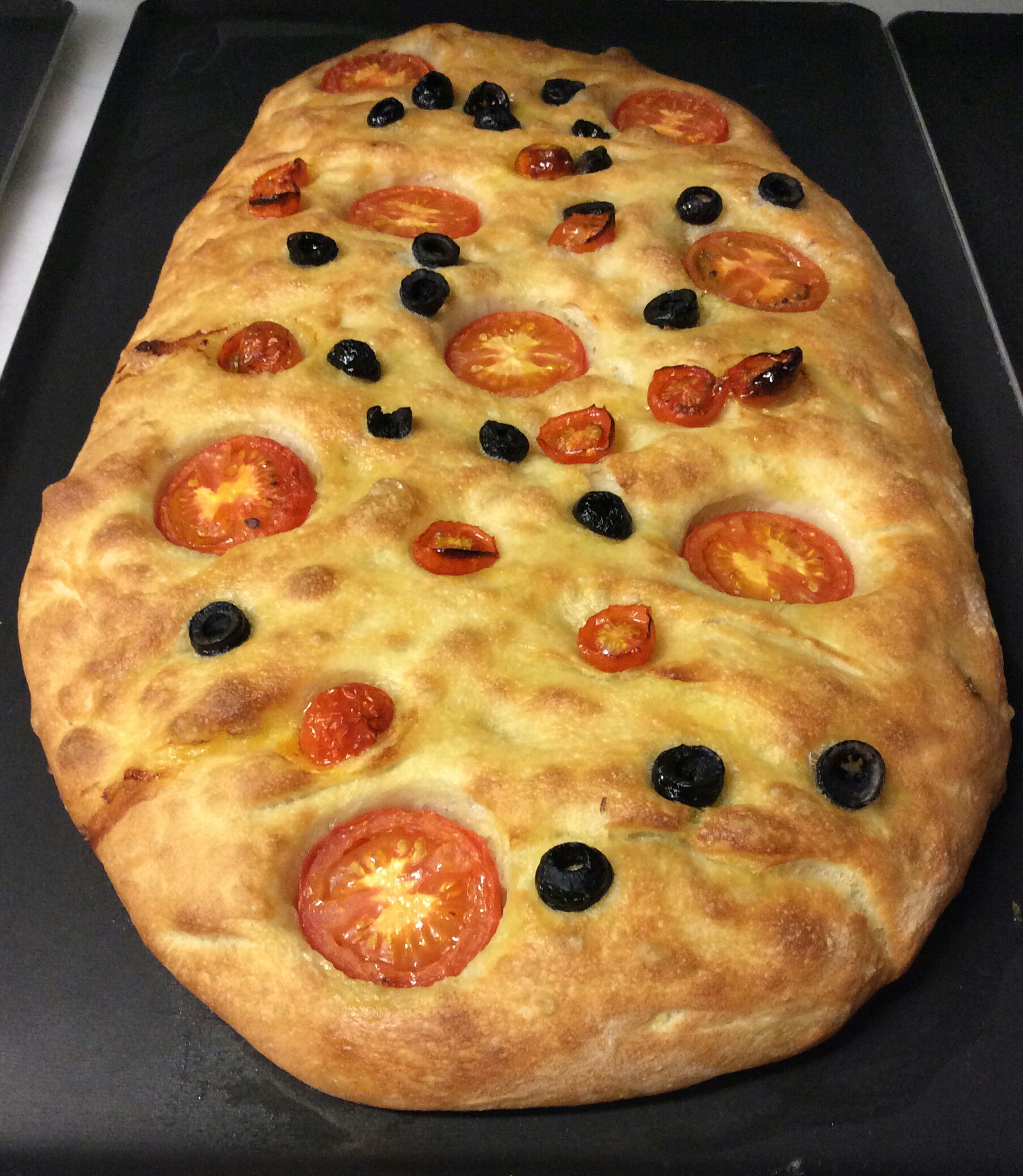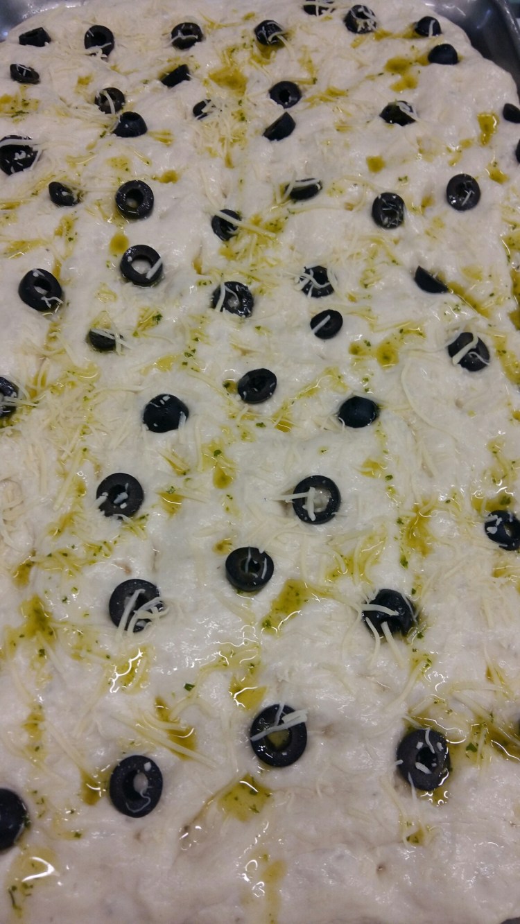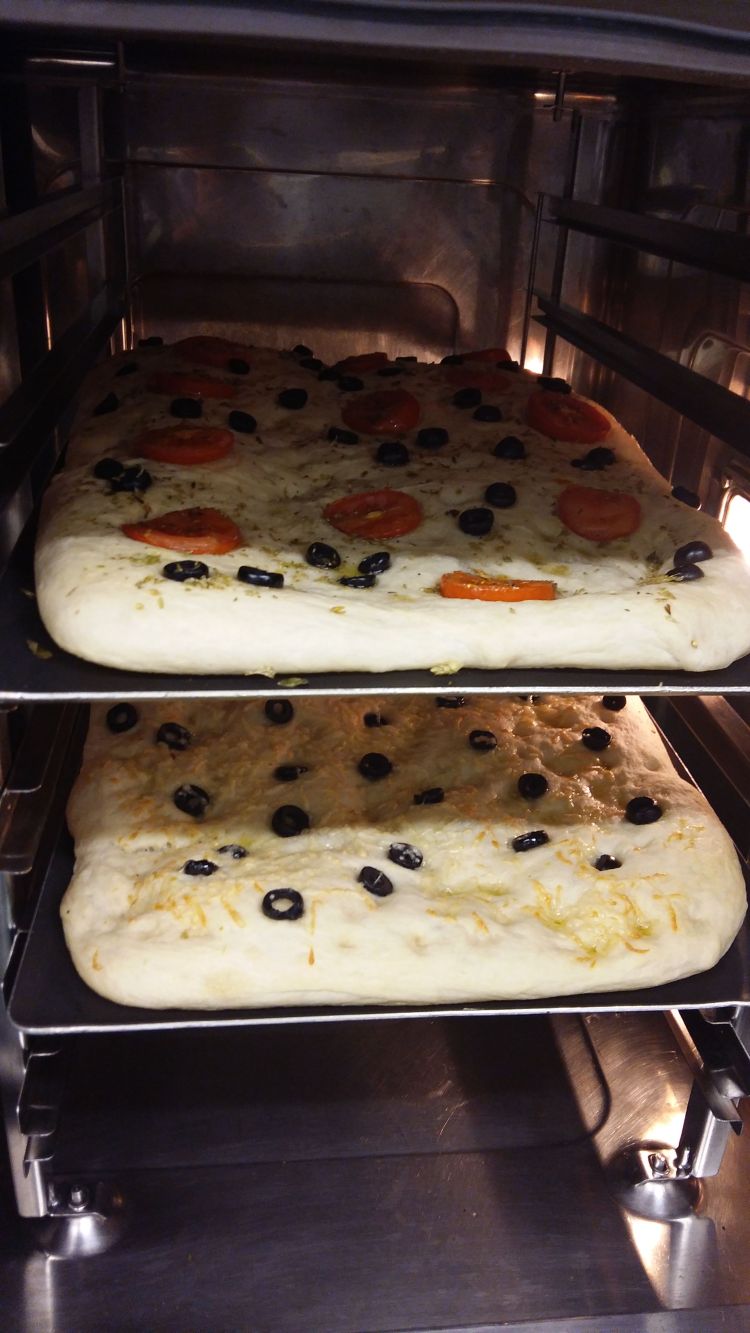 Dividir masa en latas de cocción y dejar subir 1hora, formar con dedos y aceite de oliva dejando la marca de dedos.