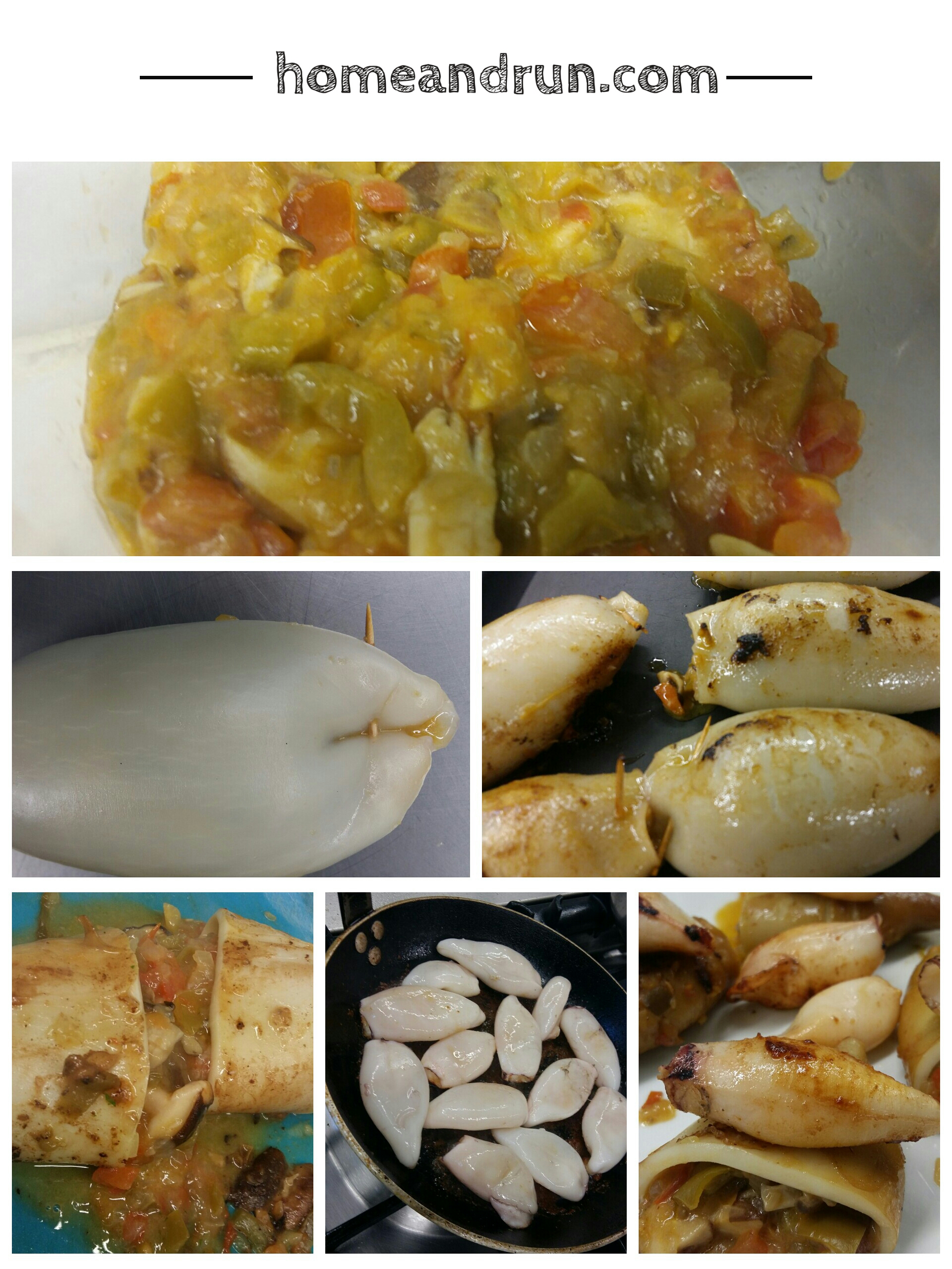 Llenamos los calamares con el relleno y cerramos con un palillo.