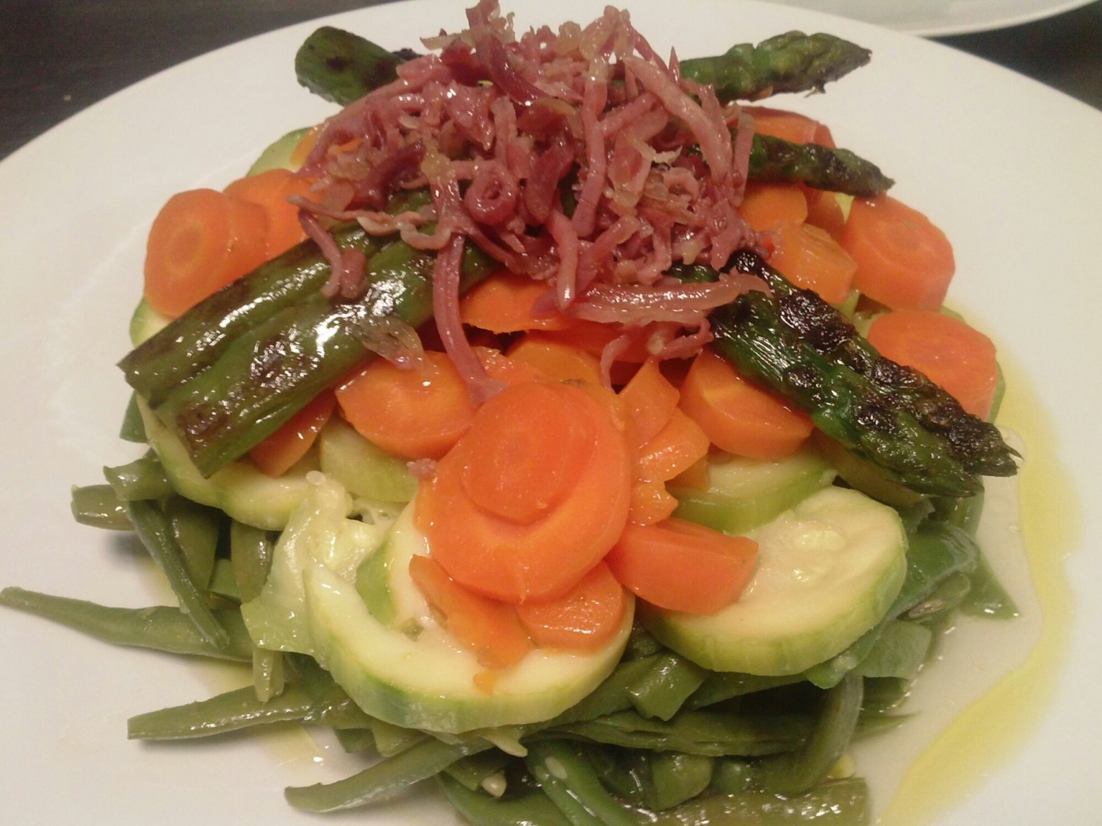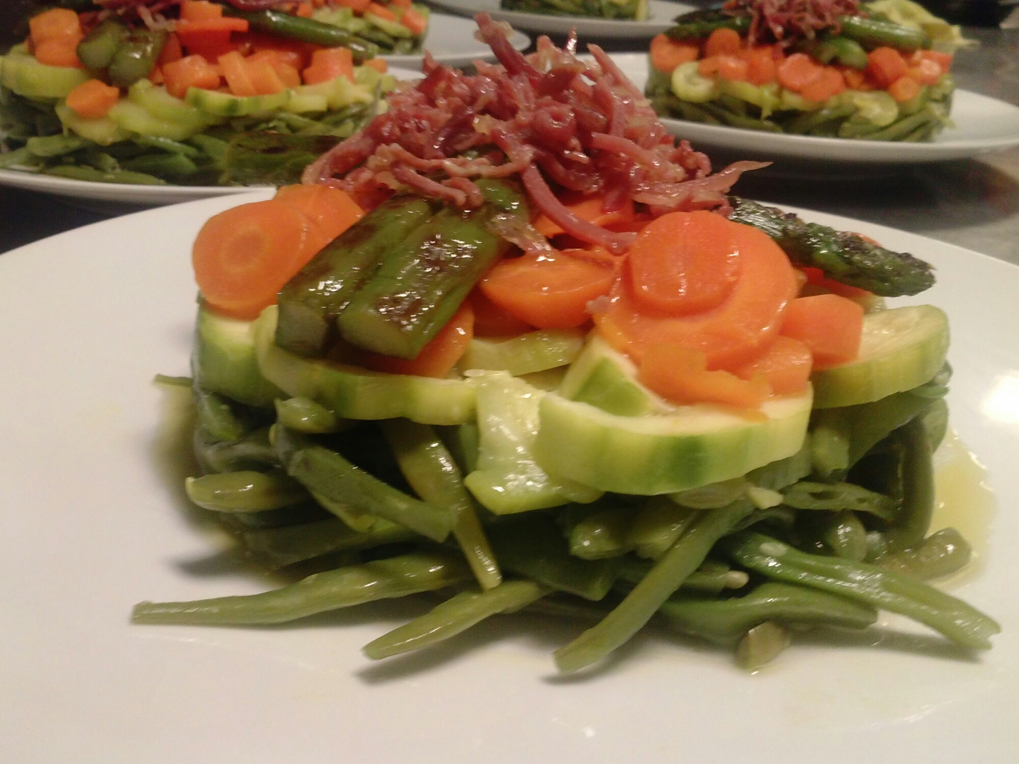 Pelamos el calabacín, la zanahoria y cocemos todo por separado. Ya que cada una de ellas requiere una temperatura y tiempo de coccion diferente. Los espárragos ademas de cocerlos los saltearemos en la sartén con un poco de aceite. Lo bonito es el montaje y presentación. Con la ayuda de un aro colocamos las verduras haciendo un poco de presión. En el último momento, salteamos el bacon a tiras y lo colocamos encima de las verduras.