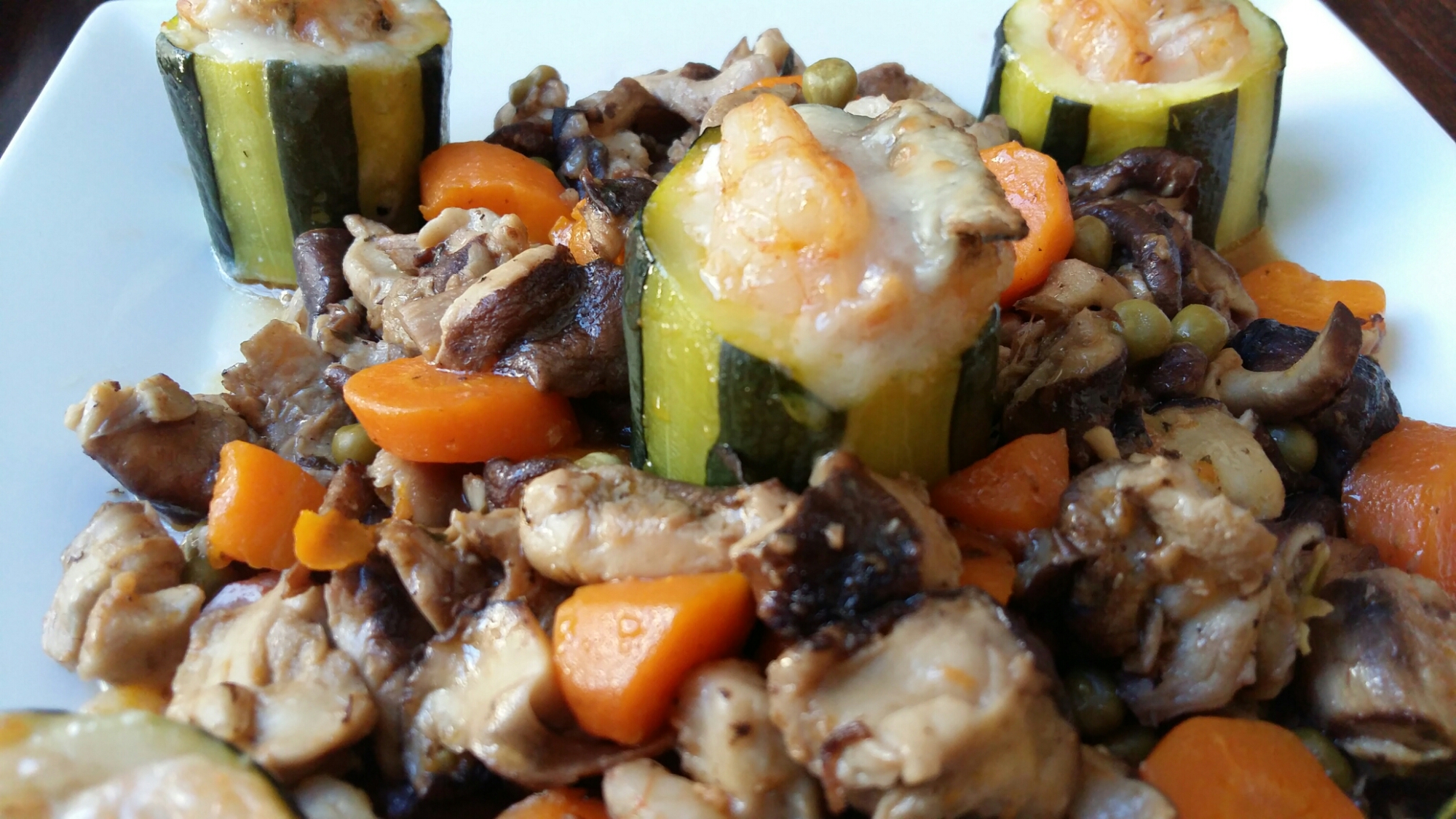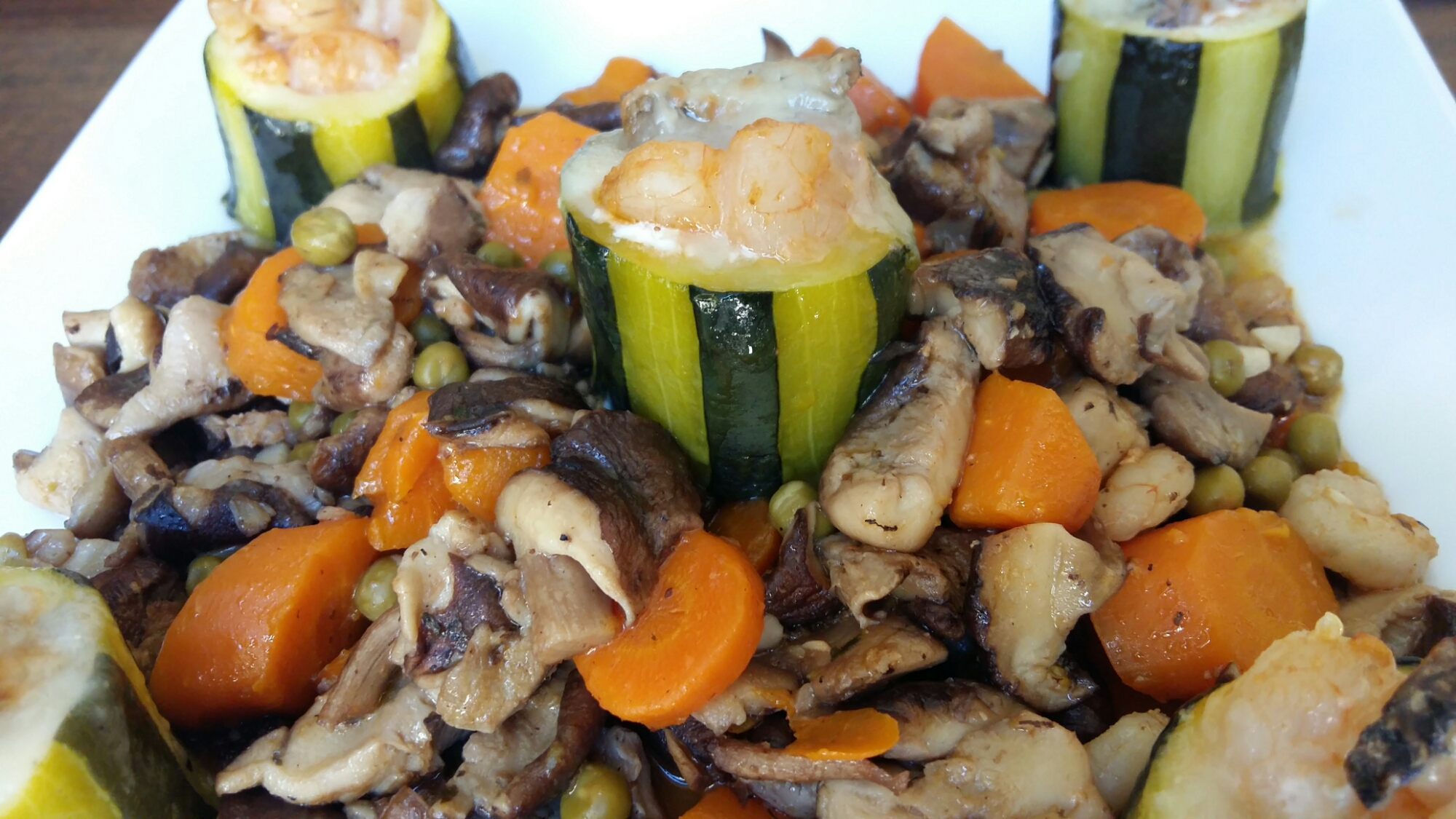 Con el calabacin se hacen estrías se parten porciones y se hace al horno a vapor. Una vez cocido con el sacabolas de quita un poco de pulpa y se rellena con cebolla, queso philadelphia y gambas al ajillo. Se pone queso de cabra y se gratina.