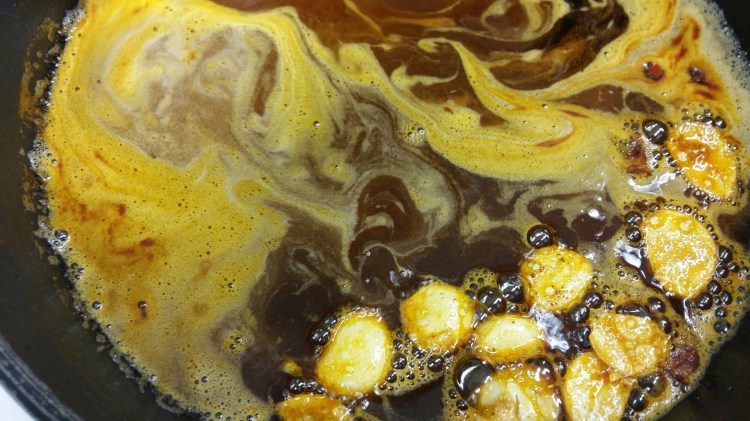 Cuando casi las tengamos ponemos una satén con aceite y ajos enteros a fuego medio fuerte.
