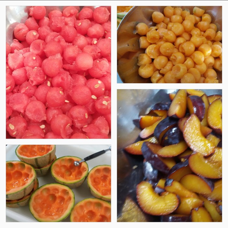 Con un sacabolas pequeño hacemos bolitas de melón y sandia.
