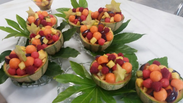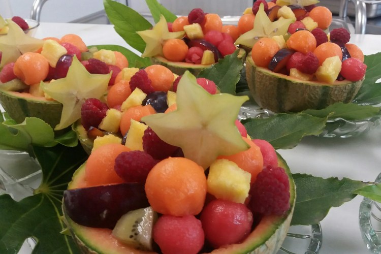 Podemos decorar la Macedonia con carambola y frambuesa. En la base del plato he colocado hojas grandes y exóticas de mi jardín. Ayuda a que no resbale el melón y le da un toque muy original…