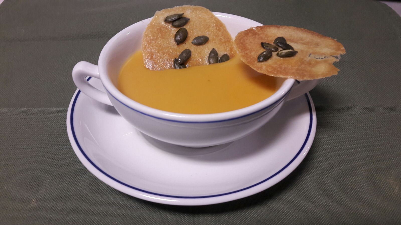 Se rehoga la cebolla con la calabaza, después se añade el pimiento rojo. Añadimos el agua y la patata. Se deja hacer hasta que esta la patata y la calabaza blanda. Trituramos y pasamos por el chino. Y salpimentamos.