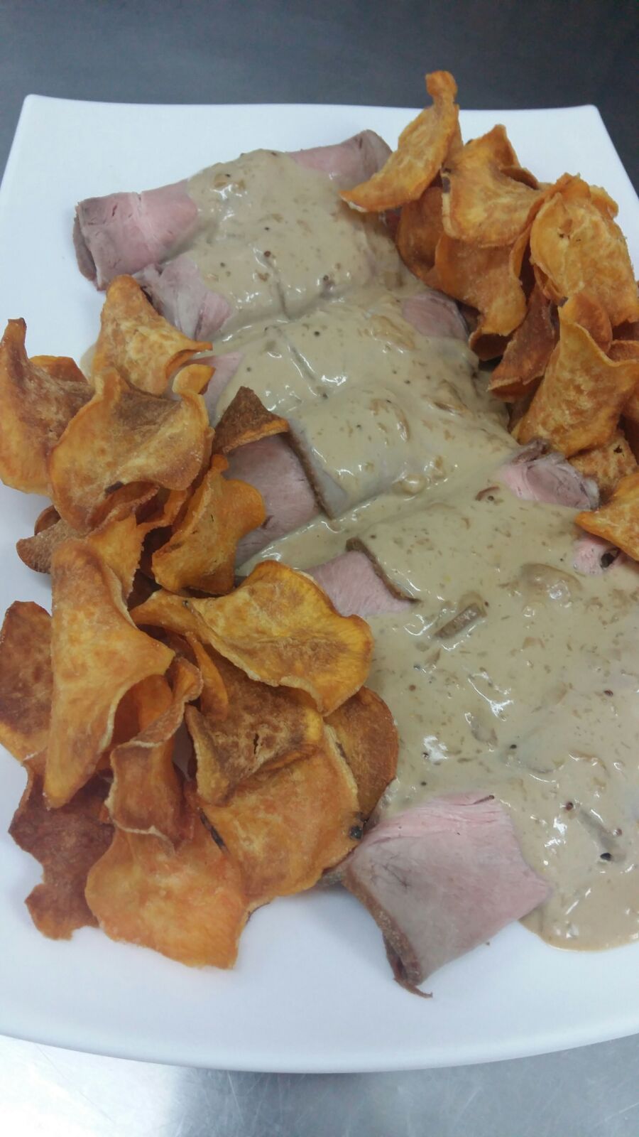 Montage: hacer un rulito con dos láminas d carne y rellenarlo con la cebolla caramelizada. Salsear con la salsa, y guarnecer con las chips