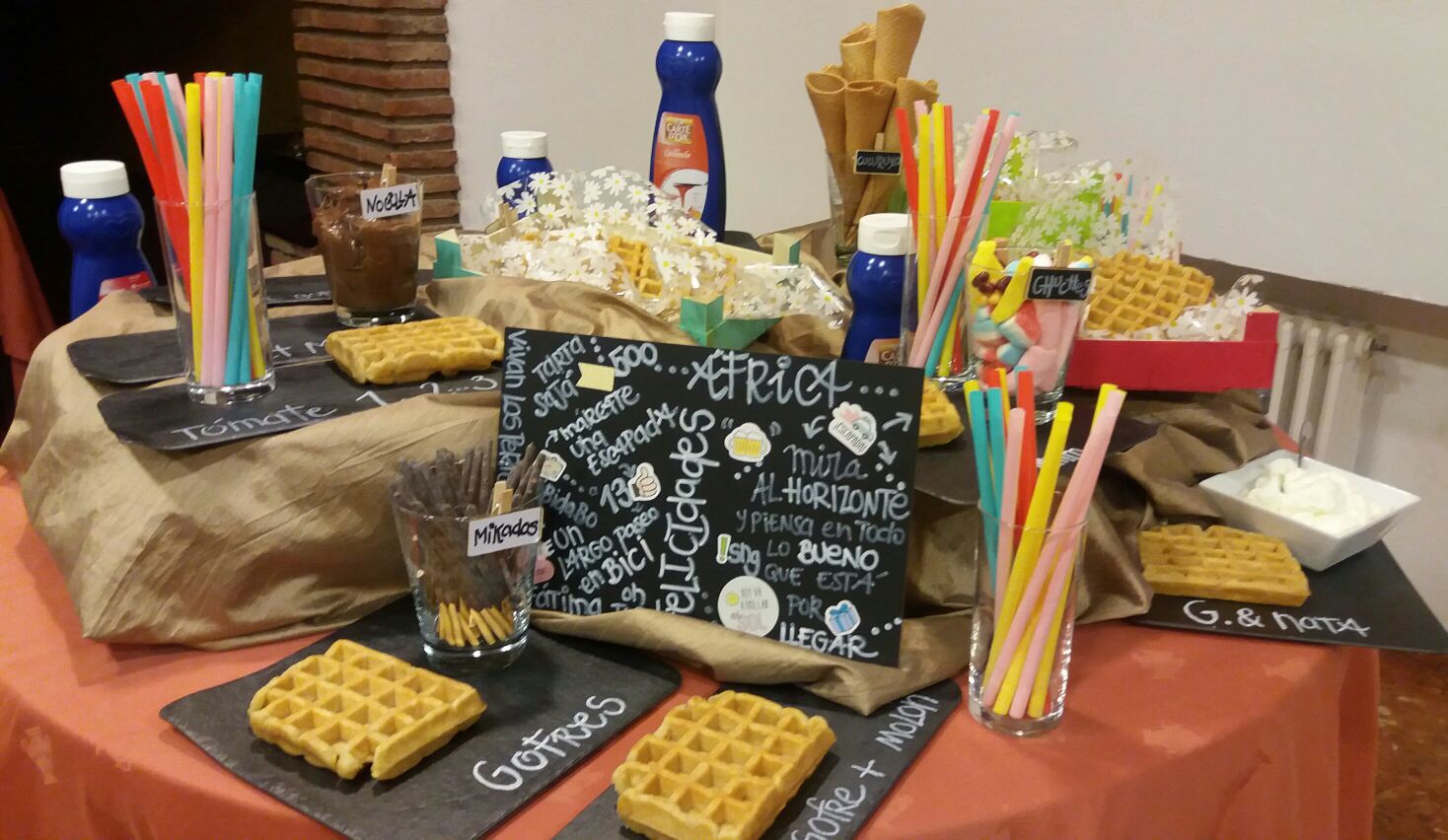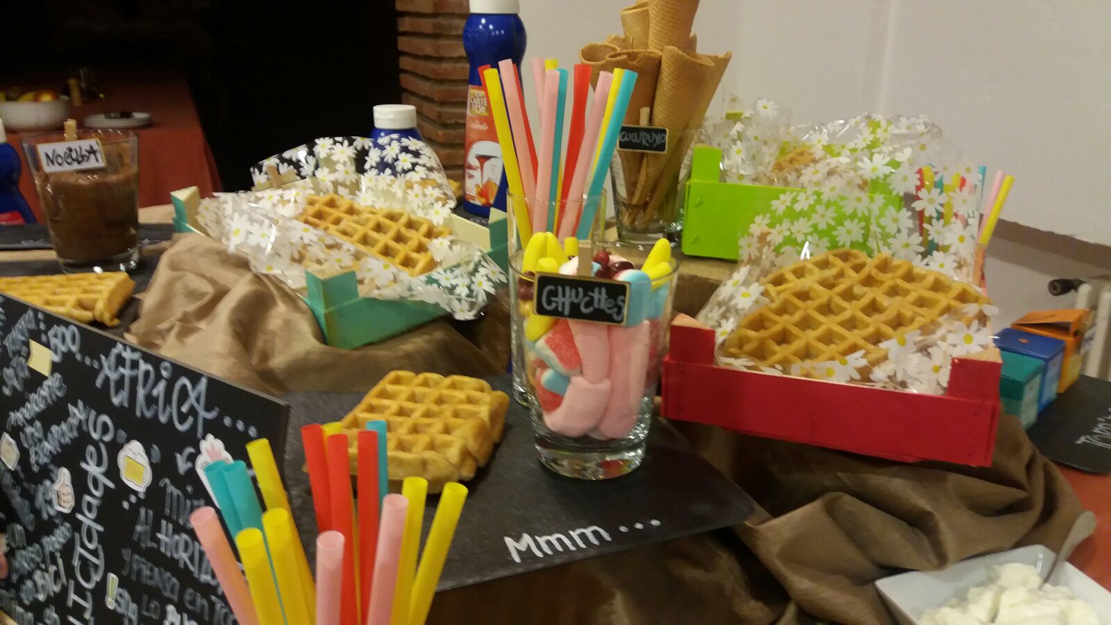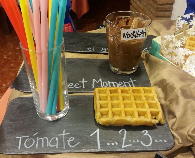 Con un poco de imaginación puedes preparar esta merienda sorpresa a tus amigos. Utilicé platos de pizarra negros para presentar el postre y los rotulé con frases como»tomate 1…2…3…, diseña tu gofre,…. el gofre más original»…