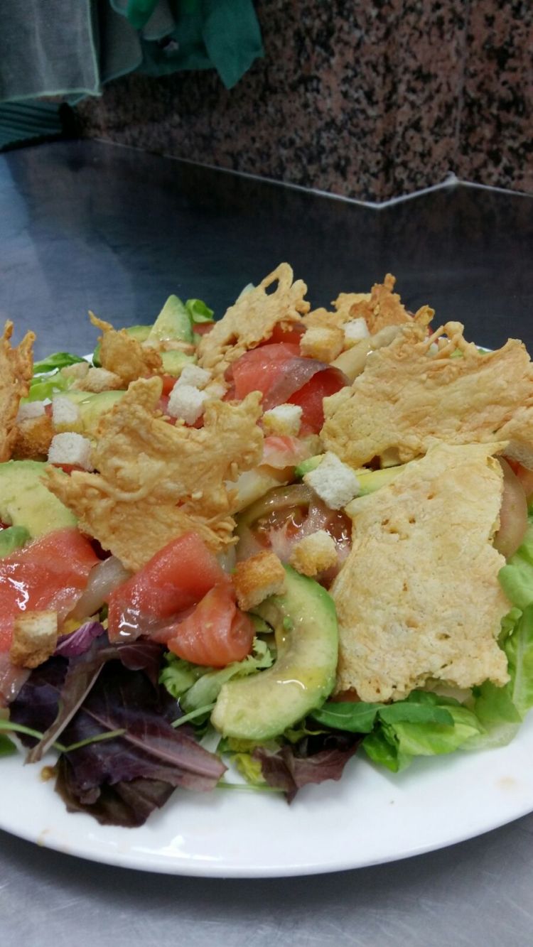 Poner en la base el mezclum de lechuga. Cortar el tomate a ruedas y poner el aguacate encima cortado previamente en gajos.