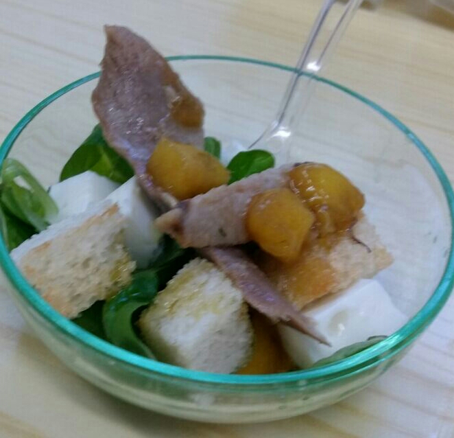 Vinagreta de mango a cuadraditos, aceite, vinagre de jerez. Dejarlo macerar 1 día por lo menos.