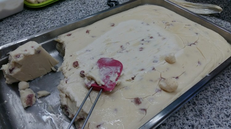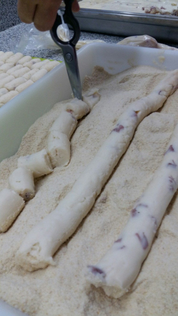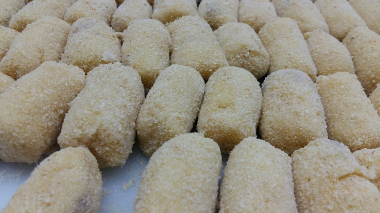 Una vez fría en una maga pastelera colocamos la bechamel y cortamos según el tamaño de croquetas que queremos.