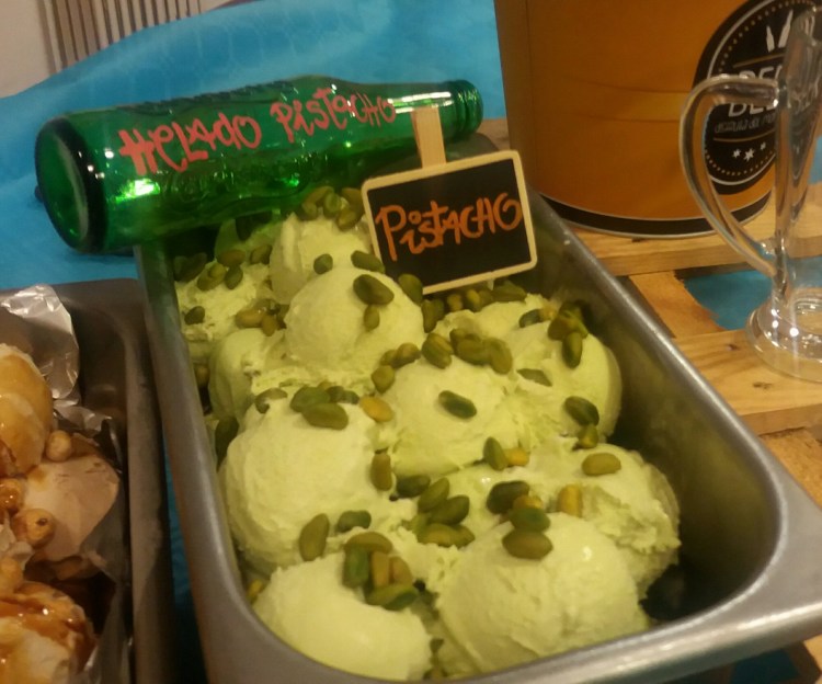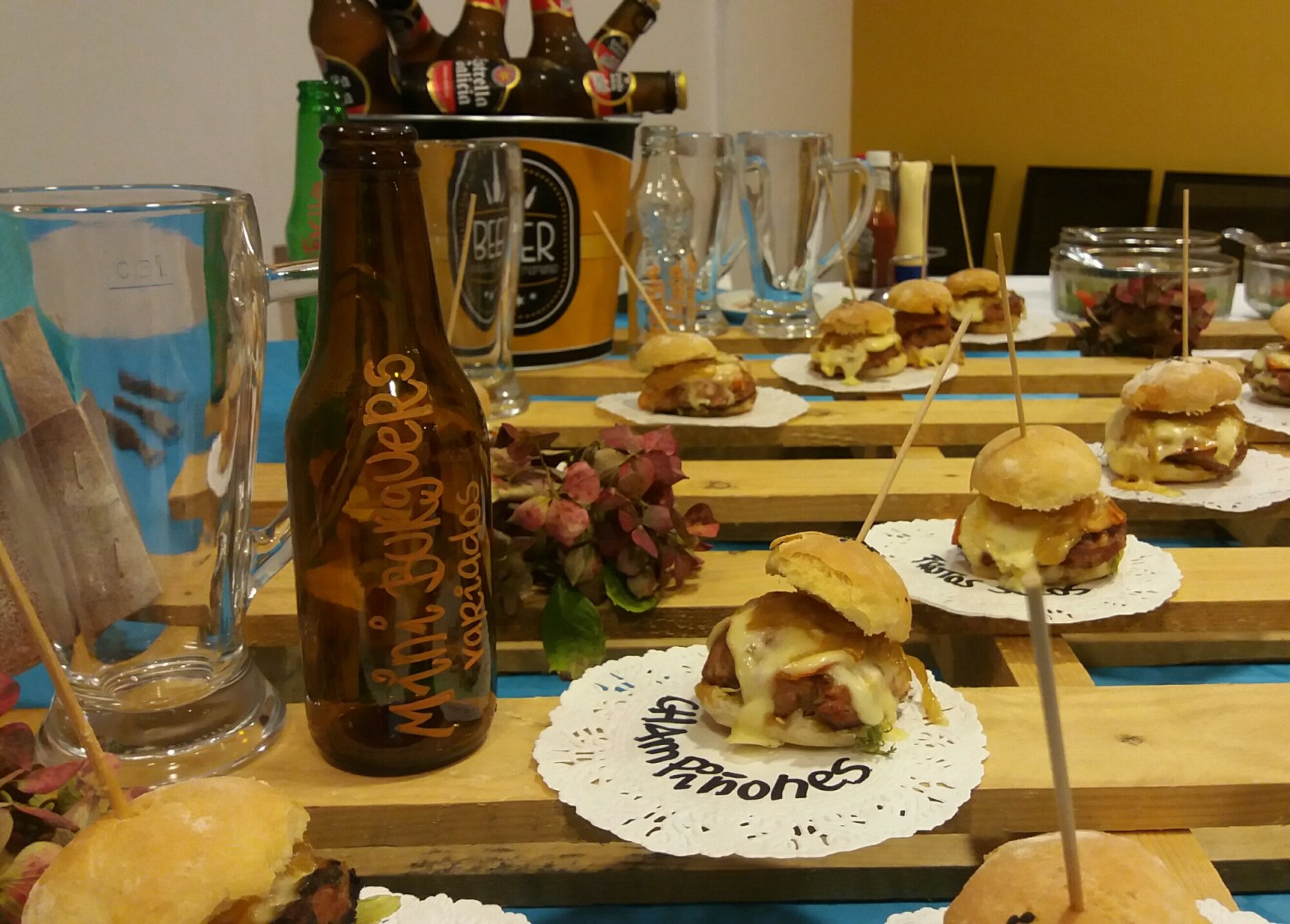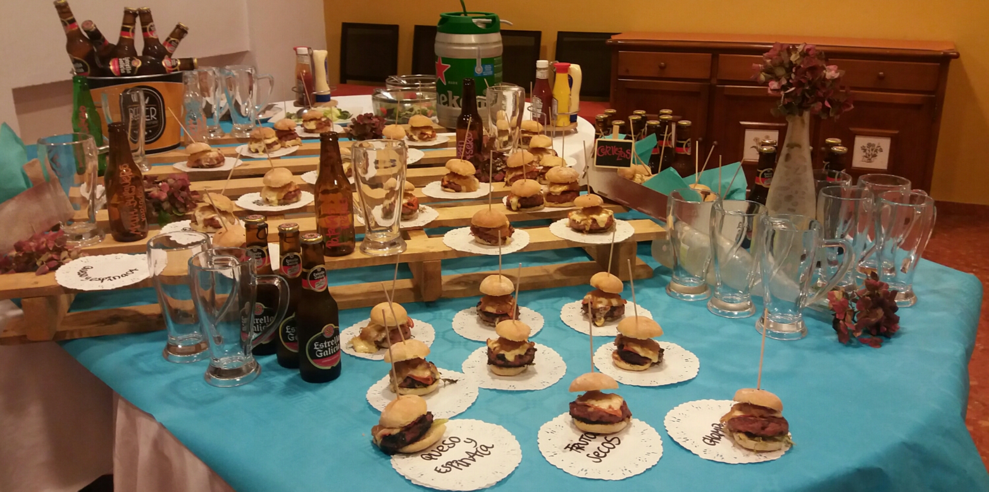 El remate de la cena fue la presentación sobre un palé 🤔😮. Unas cervezas vacías y limpias sirvieron para escribir el menú y una caja de madera de fruta pintada con spray de bandeja para las hamburguesas. El postre fue helado. La presentación casi como la vemos en las heladerias… os dejo con las fotos que hablan por si solas.