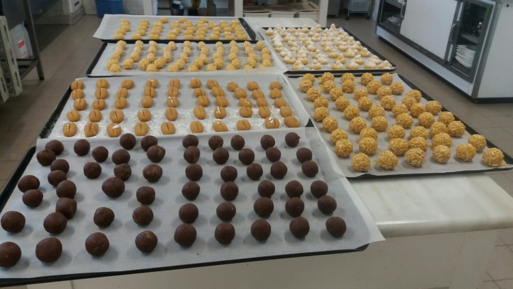 Formamos los panellets de unos 20 gr. Si queremos añadirles gusto a cafe o chocolate, añadiremos un poco de cada sabor una vez hayamos hecho la masa, antes de formarlos.