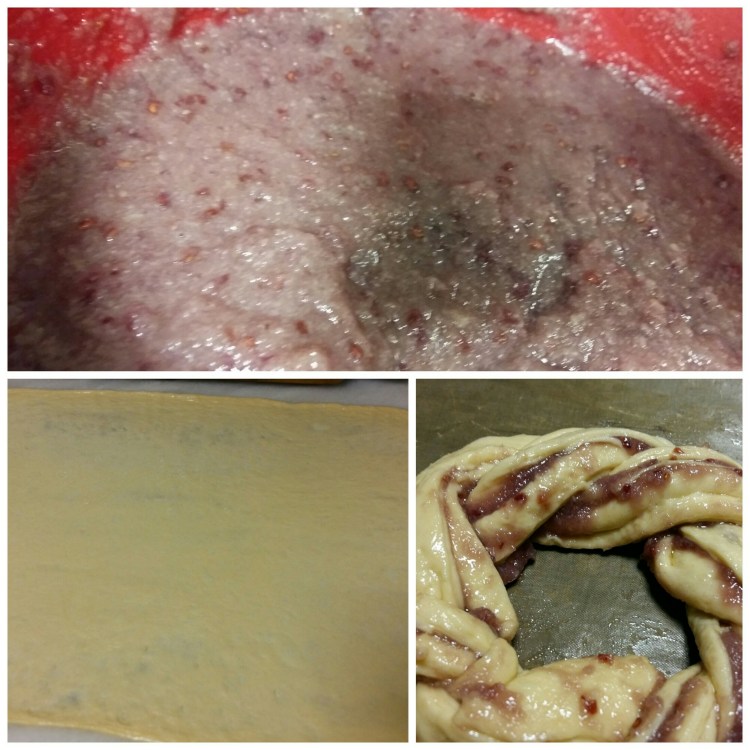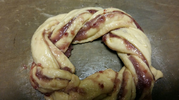 Estirar la masa con rodillo, añadir el relleno del mazapán (no es necesaria mucha cantidad-2 cucharadas por pieza ). Hacemos un rulo,cortamos a mitad y trenzamos.