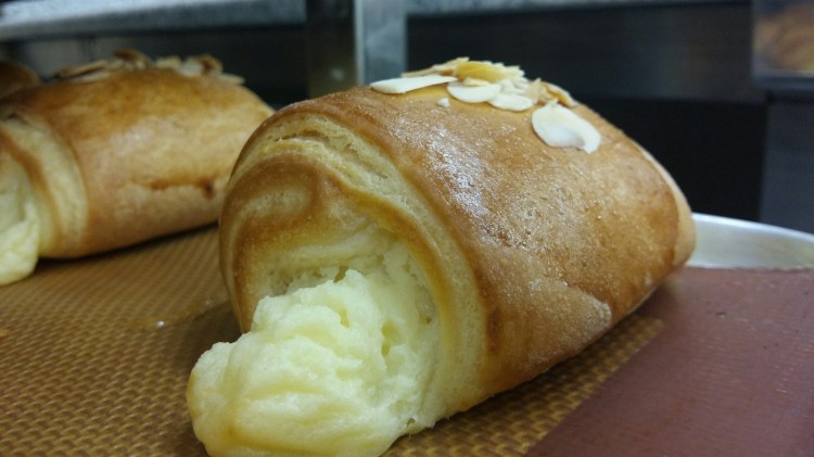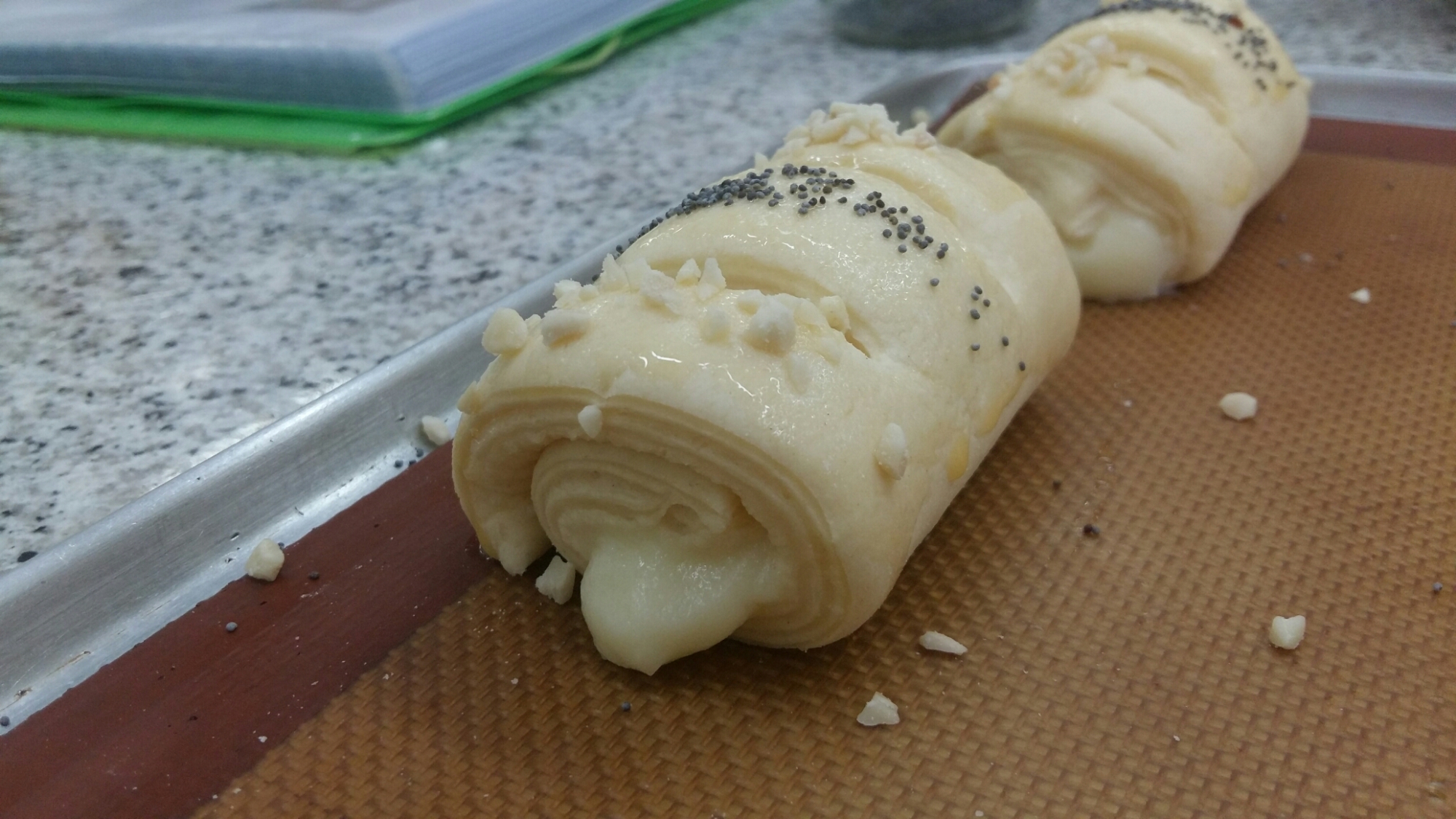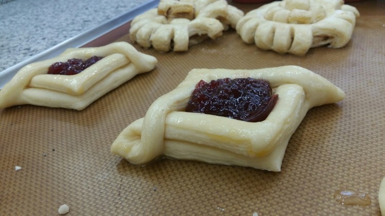 Formamos los bollos según nos guste. Esta masa es muy buena para hacer napolitanas, o bretzel, caracolas, cangrejos…Una vez formados dejamos que suba pintamos de huevo decoramos al gusto y cocemos a 170º entre 15 y 20 minutos.