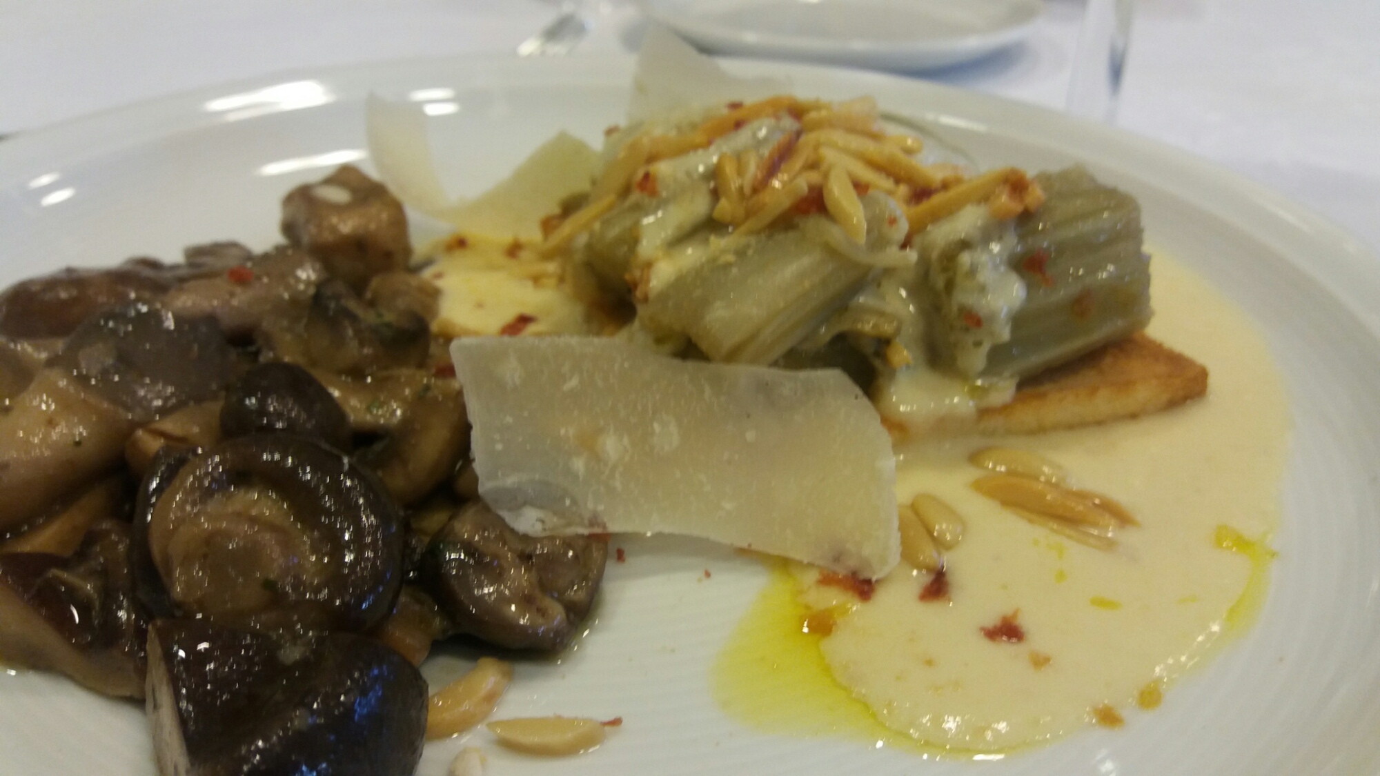 Saltear las setas y colocarlas al lado de la lasaña de cardo y foie. Finalmente, cubrir con la salsa el cardo y decorar con piñones tostados, jamón serrano cortado muy fino y salteado y lascas de parmesano.