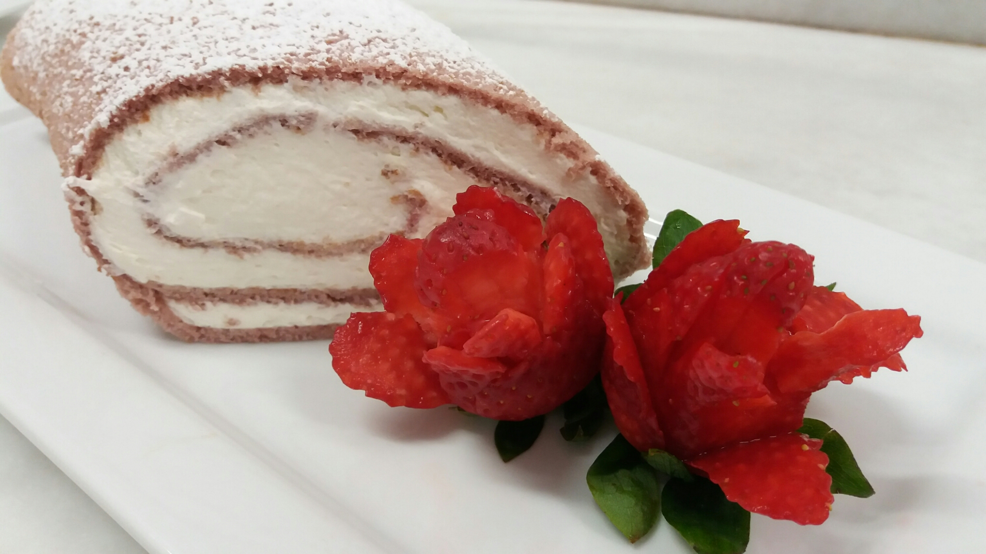Batir los huevos con el azucar, añadir la harina mezclada con la levadura y el puré de fresas. Extender sobre la bandeja de horno con papel y hornear a 180°C durante 8 minutos aproximadamente.