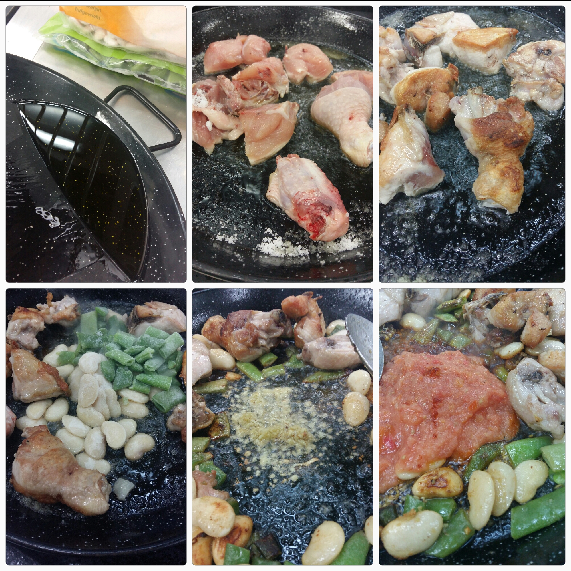 Una vez caliente el aceite echar el pollo, y dorar. Luego añadir las verduras, y luego hacer el sofrito: primero el ajo, cuando este dorado añadir una cucharadita de pimentón y luego el tomate (com un cazo).