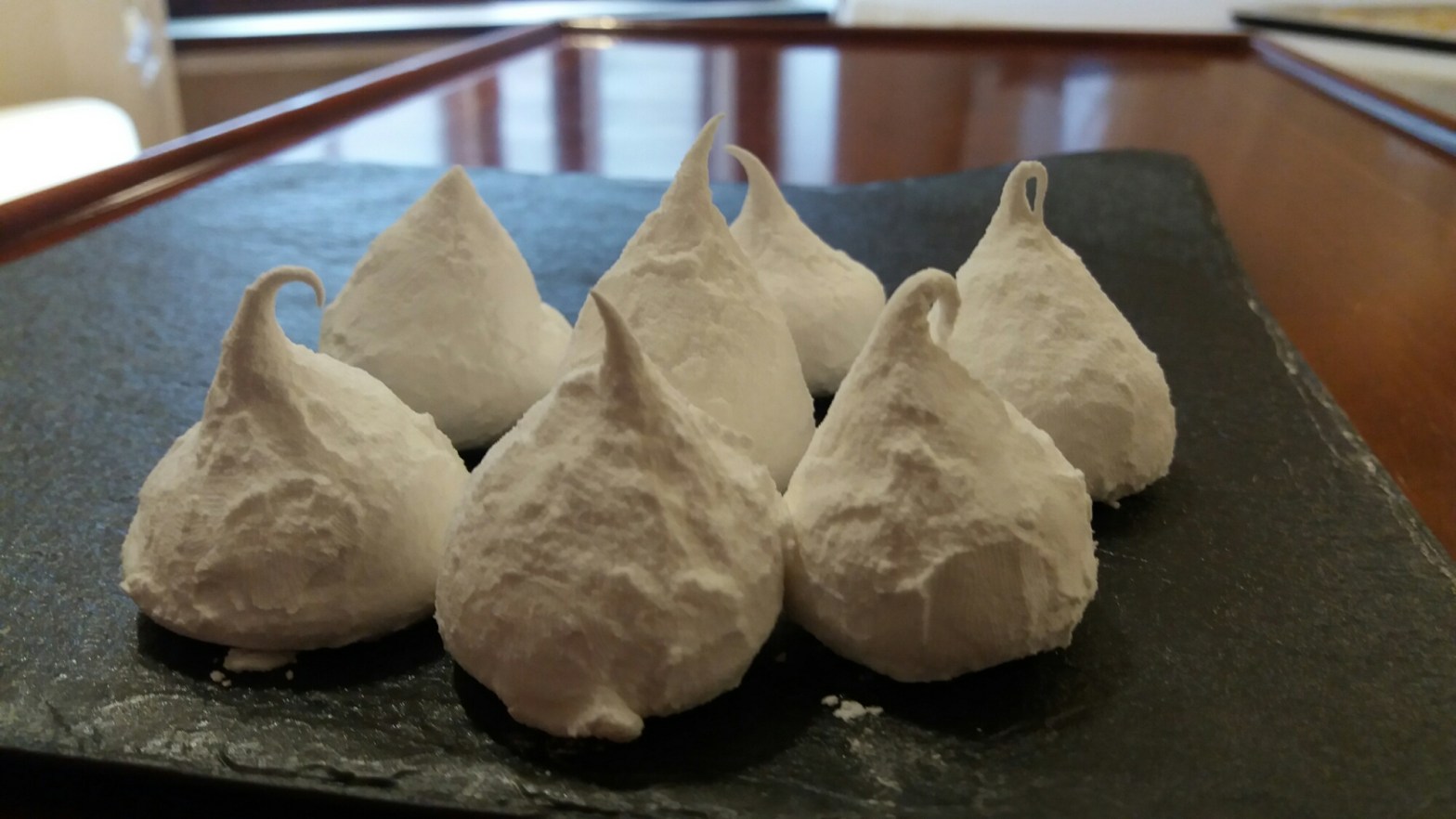 Añadir el agua de azahar y batir hasta que se enfrie. Llenar la manga y escudillar sobre papel sulfurizado puntos de merengue, espolvorear con azúcar y maicena. Enfriar en la nevera unas 3 horas.