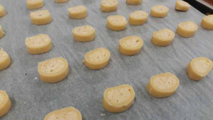 Una vez frías, se cortan en rebanadas de unos 4 mm de ancho, colocándolas en latas de hornear con el corte como base y cara. Pintar la parte superior con huevo situando encima de cada piezq un poco de azúcar. En horno no muy fuerte cocer durante 20 minutos hasta que estén doradas.
