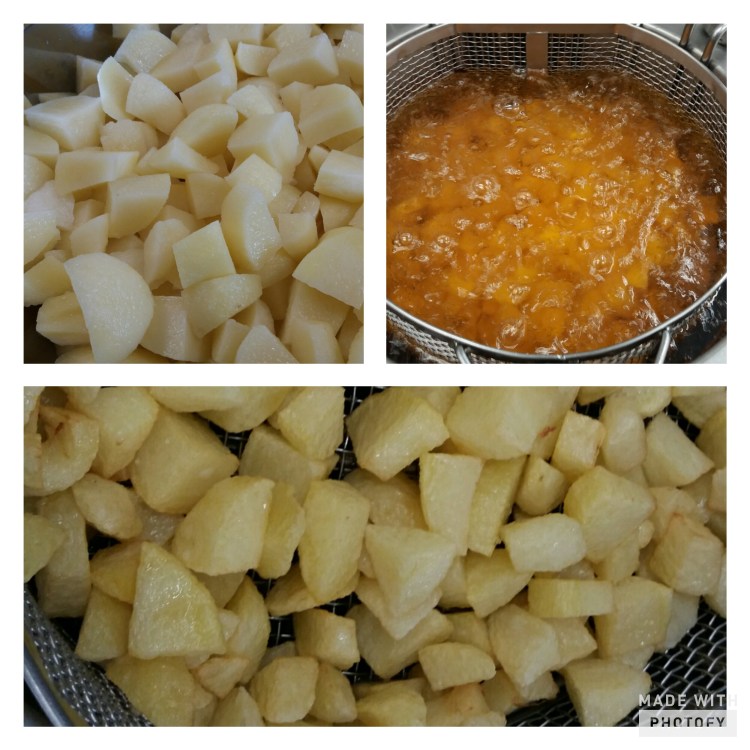 Pelar las patatas y cortarlas a cascos medianos. Freir en dos veces. La primera a 120 grados y la segunda vez a 170. De esta manera quedarán crujientes por fuera y tiernas por dentro. Dejar sobre una bandeja con papel absorvente, para retirar el exceso de aceite.