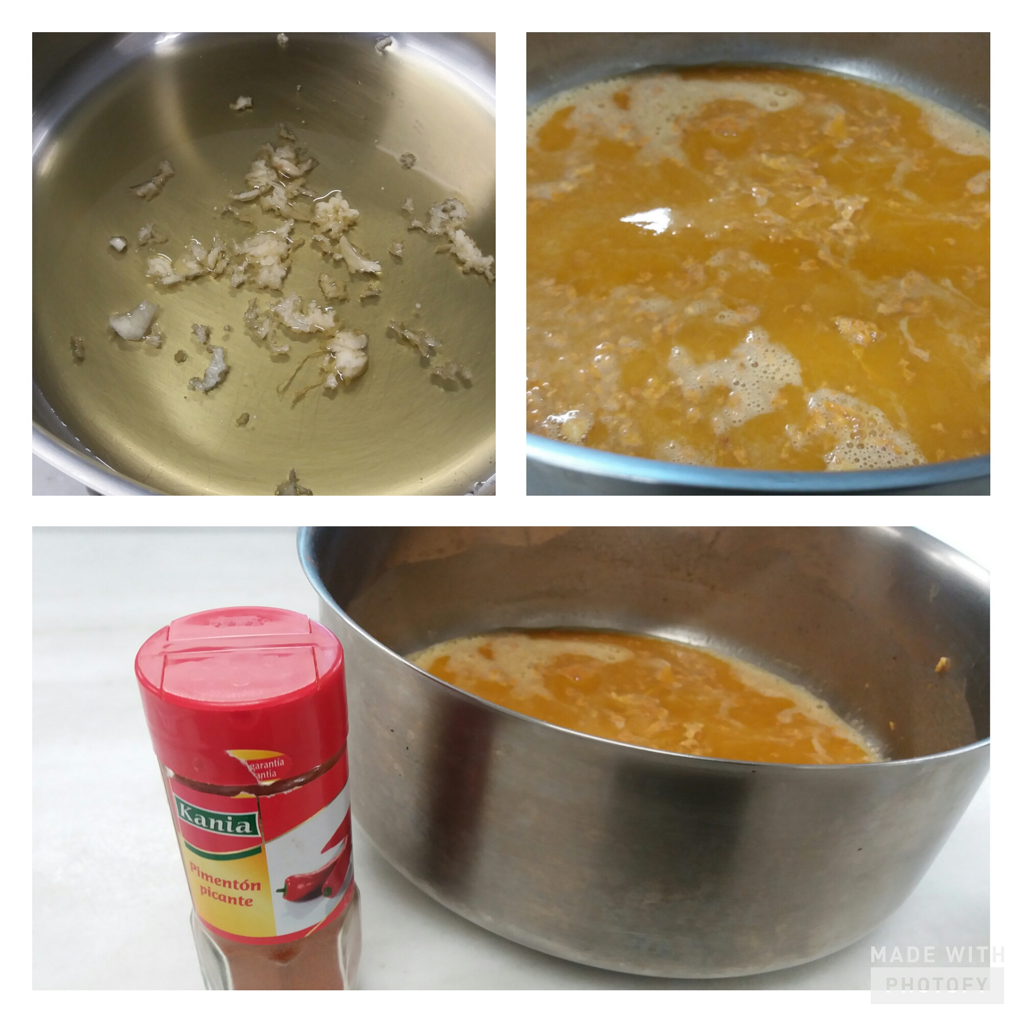 Pelar los ajos y picarlos muy finamente. Freir en aceite frio. Cuando estén dorados añadir un poco de harina y pimentón picante al gusto. Mezclar bien y reservar hasta el momento de servir. Las cantidades de cada ingrediente dependerán un poco del gusto según textura y sabor.