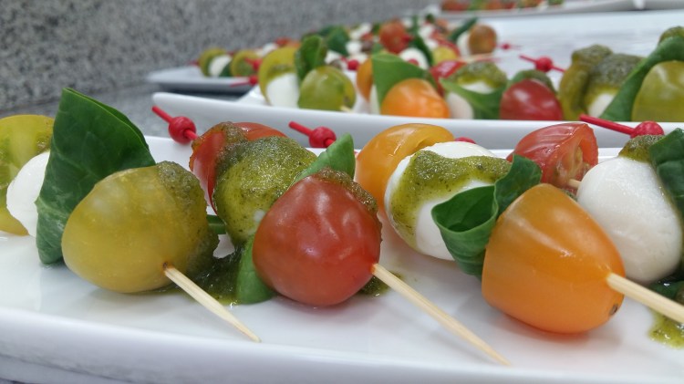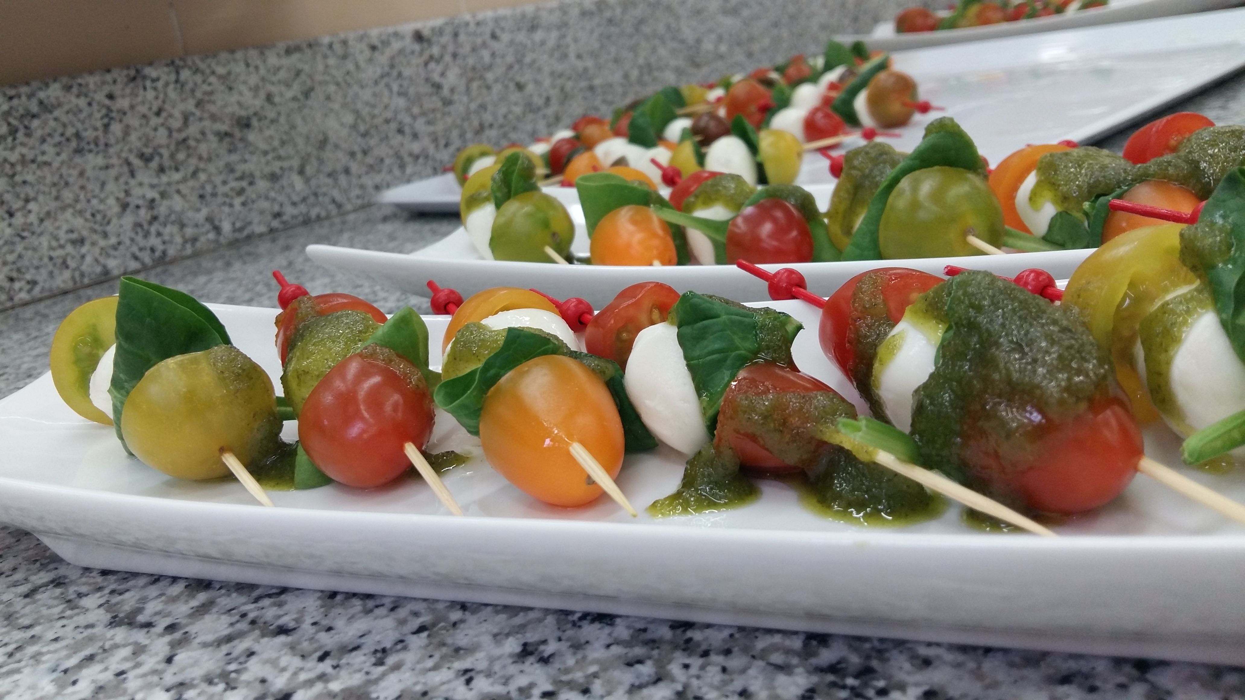 El domingo tenía que hacer de aperitivo algo sencillo, rápido y vistoso y el resultado fue estas brochetas de perlas de mozzarella con cherry y espinaca acompañadas de una salsa de peso buenísima.