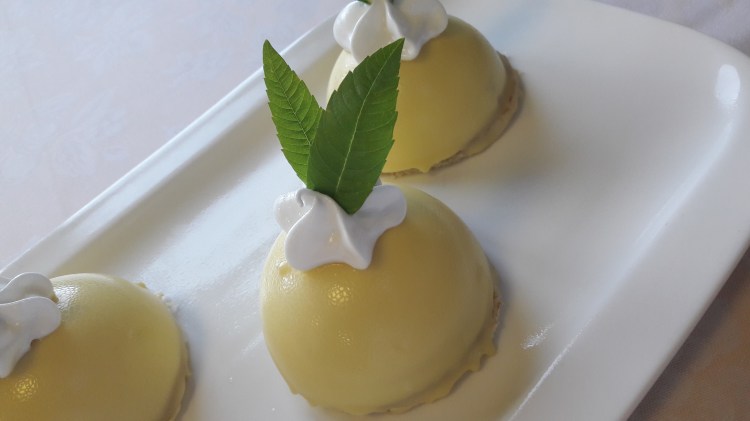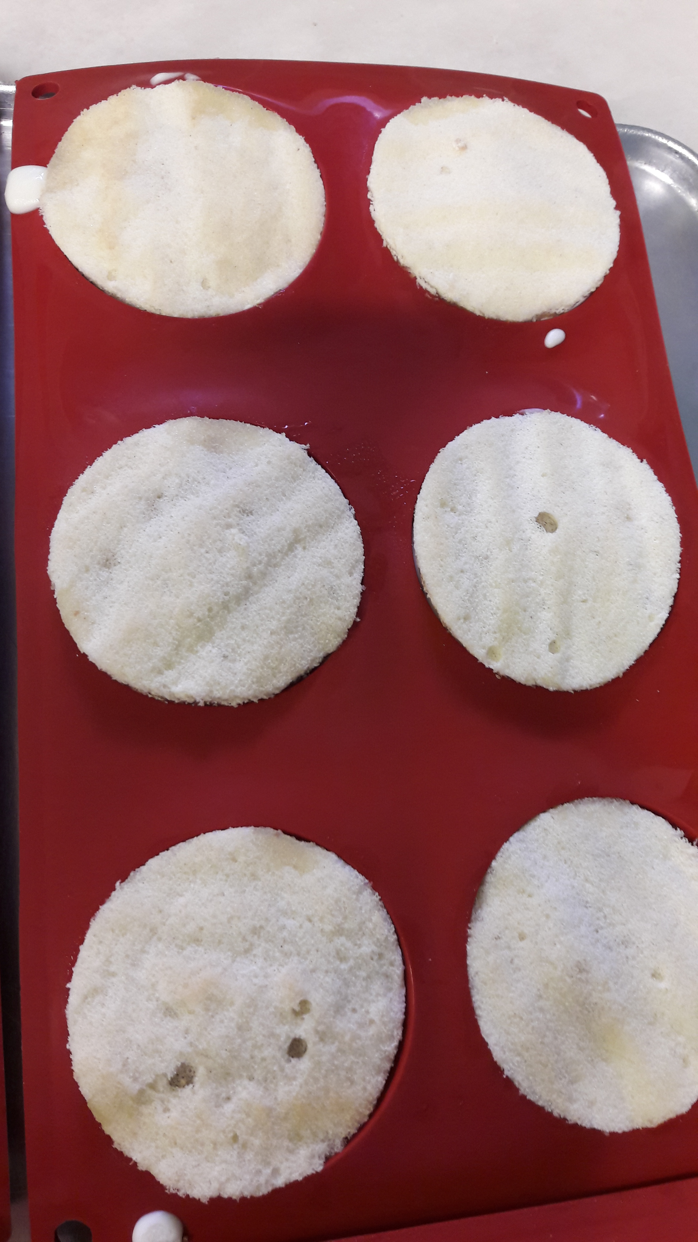 Rellenar la mitad de las esferas, poner la compota de manzana y termina de rellenar. Cerrar con la base de bizcocho bien emborrachado.