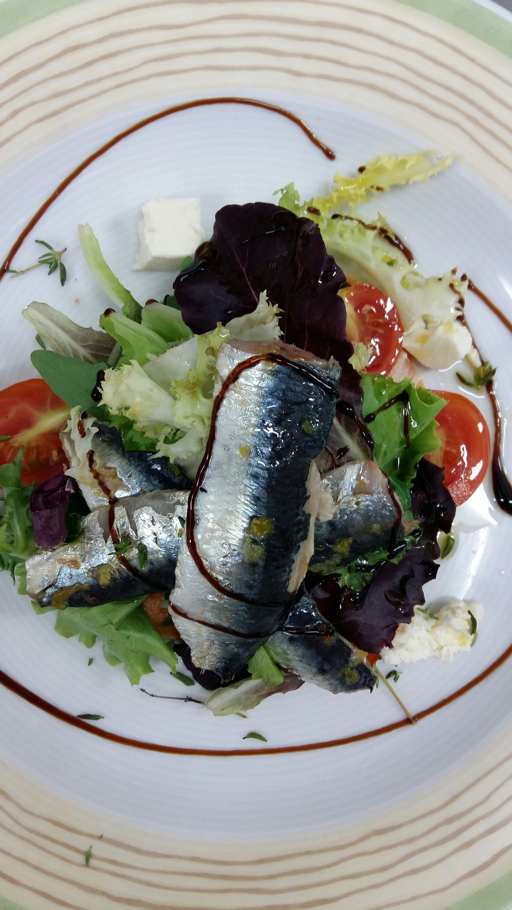 Acabamos la ensalada dándole un golpe de horno a las sardinas de 180°C 2 minutos y las ponemos por encima de la lechuga. Decoramos con flores de tomillo y vinagre balsámico.