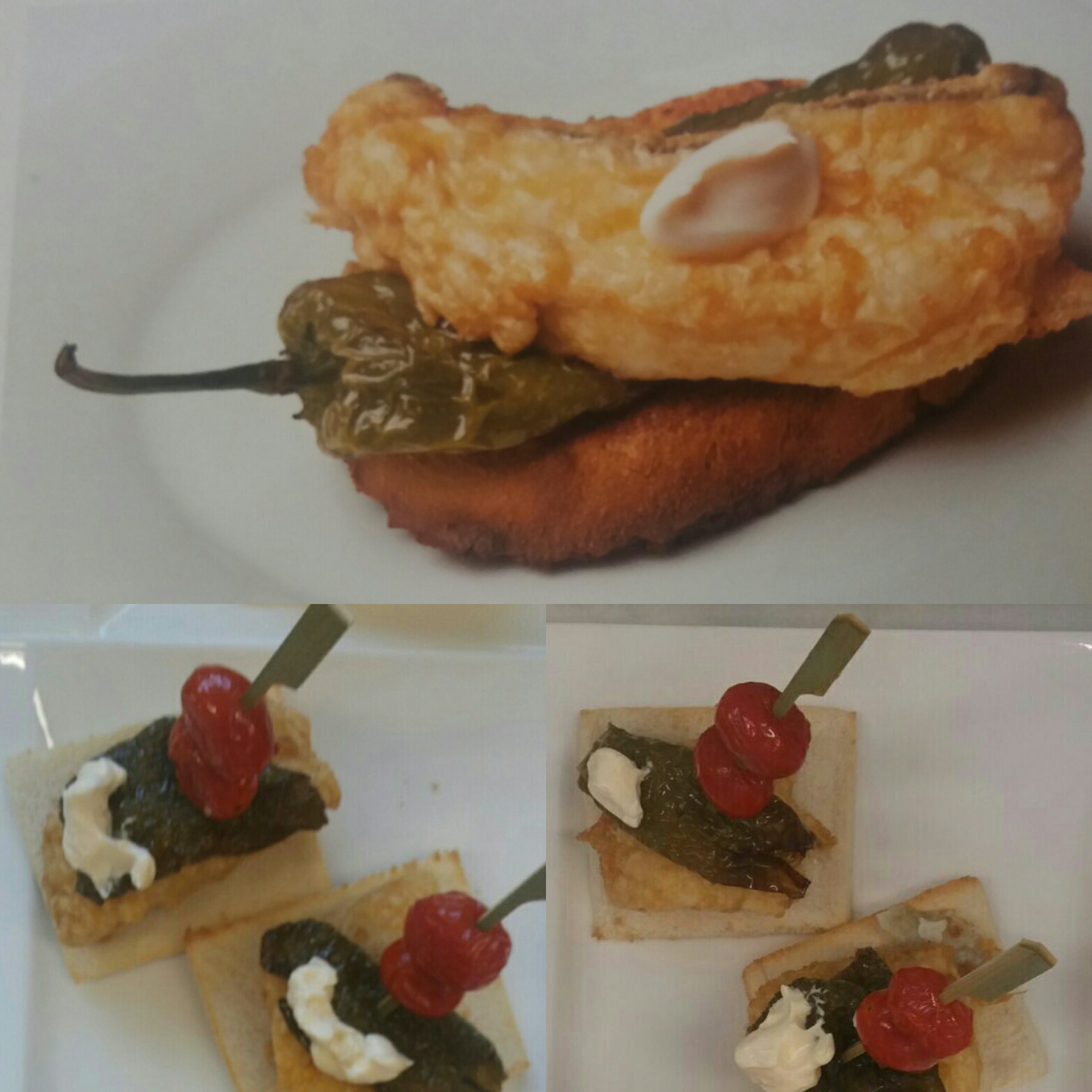 Finalmente, emplatar el montadito de bacalao; colocando el trozo de pescado encima del pan y sobre éste el pimiento y decorando con un poco de mayonesa. Hemos añadido al plato un pincho de cherry salteado para darle color