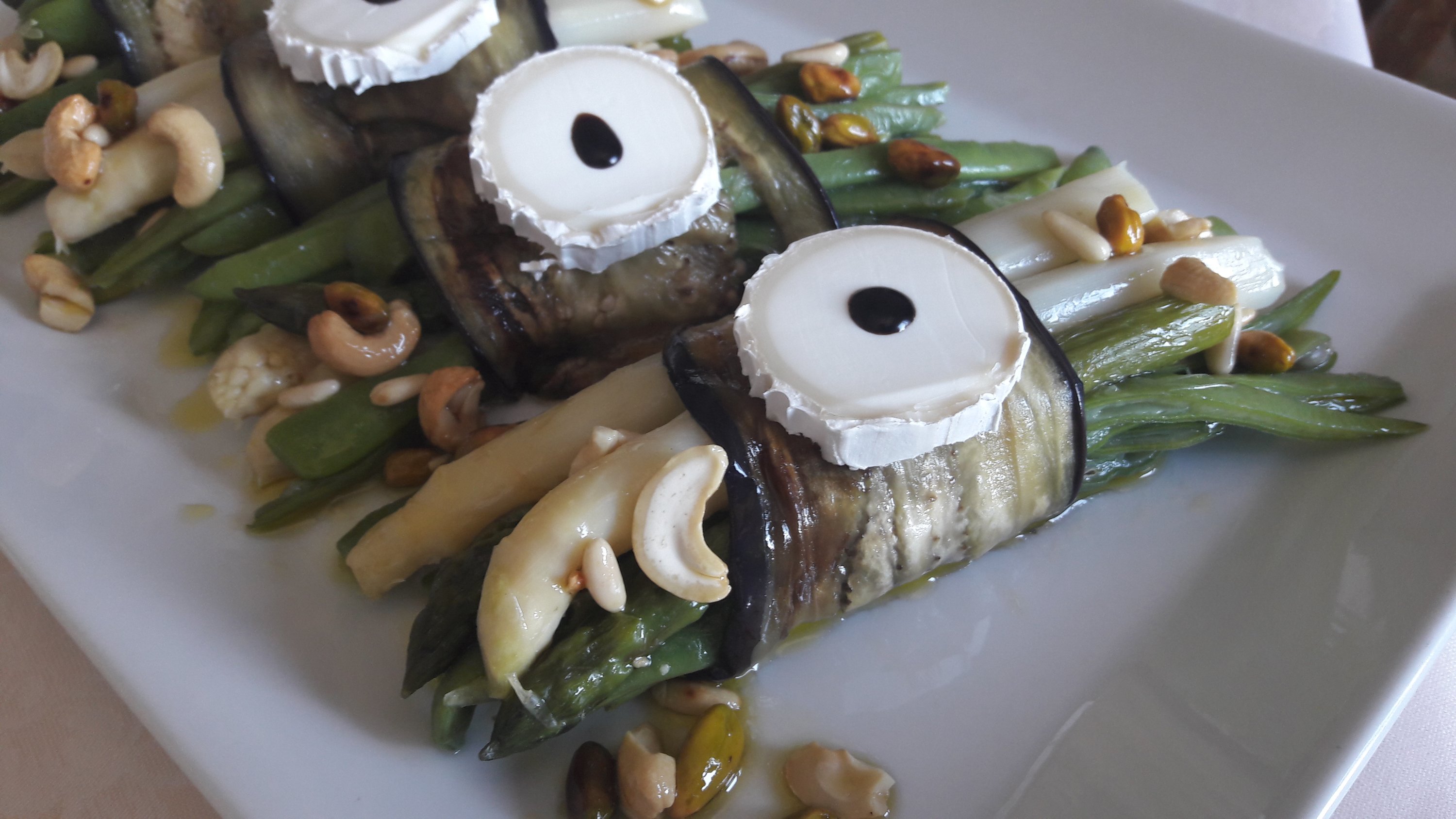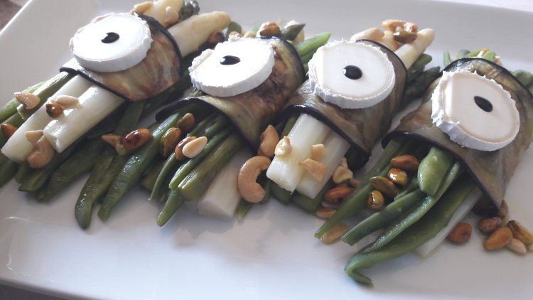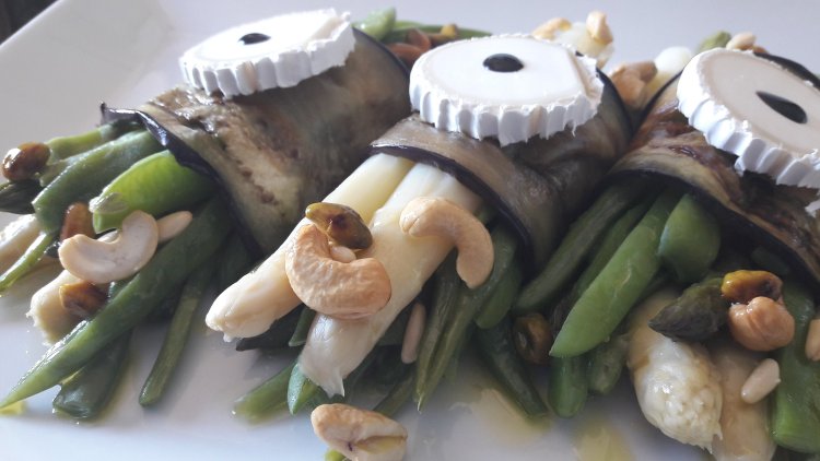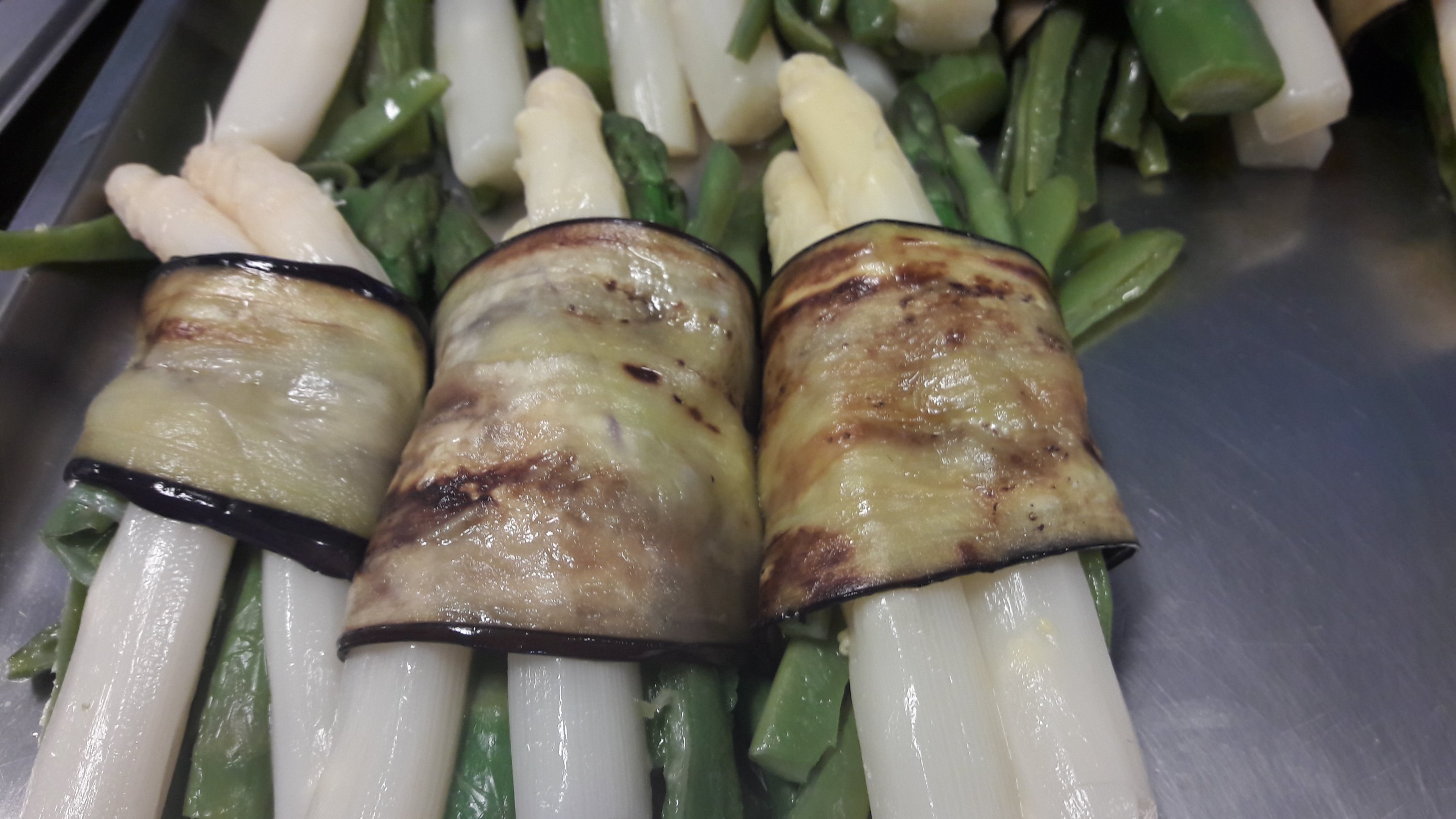 Después de manera transversal pondremos 100 gr de judías verdes por haz, 2 espárragos blancos y dos verdes y cerramos el haz. Se van colocando en la fuente donde se van a servir.