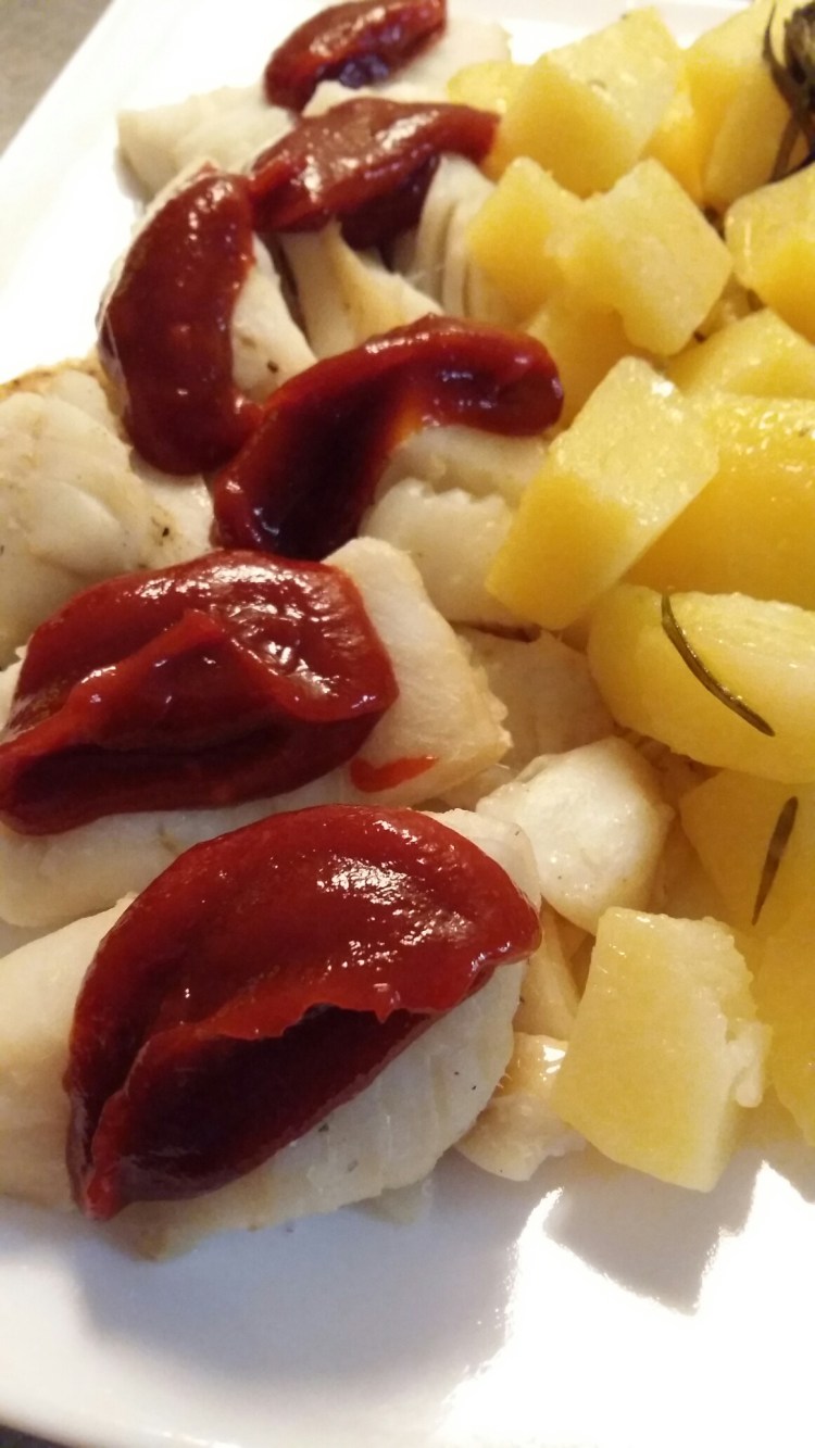 Hemos acompañado este bacalao con unas patatas al romero también hechas al vacio: Hacer a cascos las patatas, salpimentar añadir romero fresco y dejar a 90°C 40 minutos . Buenísimas, tienen un sabor espectacular.