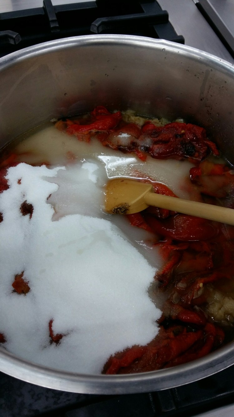 Asar lo pimientos. Pelar y quitar las pepitas. Meter en una cazuela con los demás ingredientes y dejar cocer 30′. Triturar en la thermomix hasta que quede una textura lisa. Y ya lo tenemos.