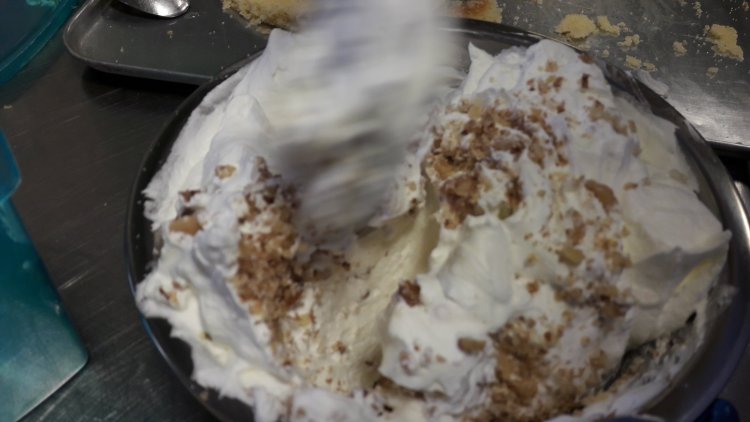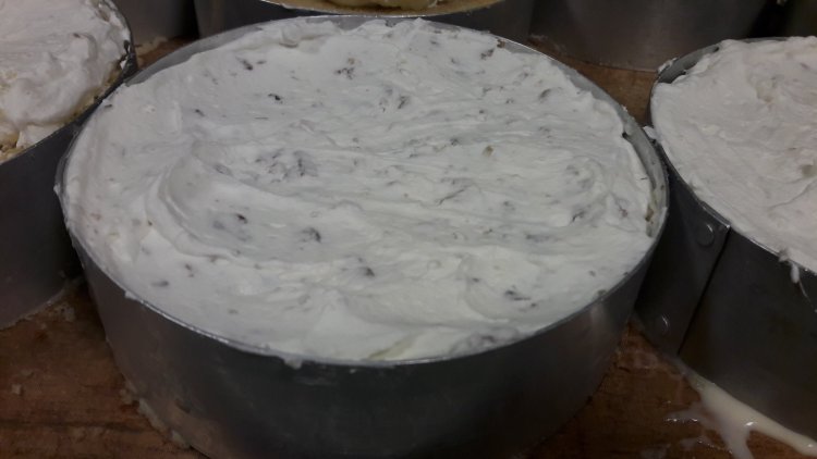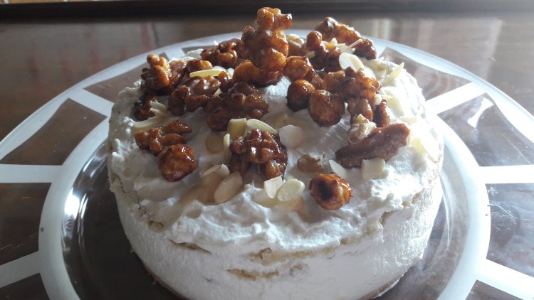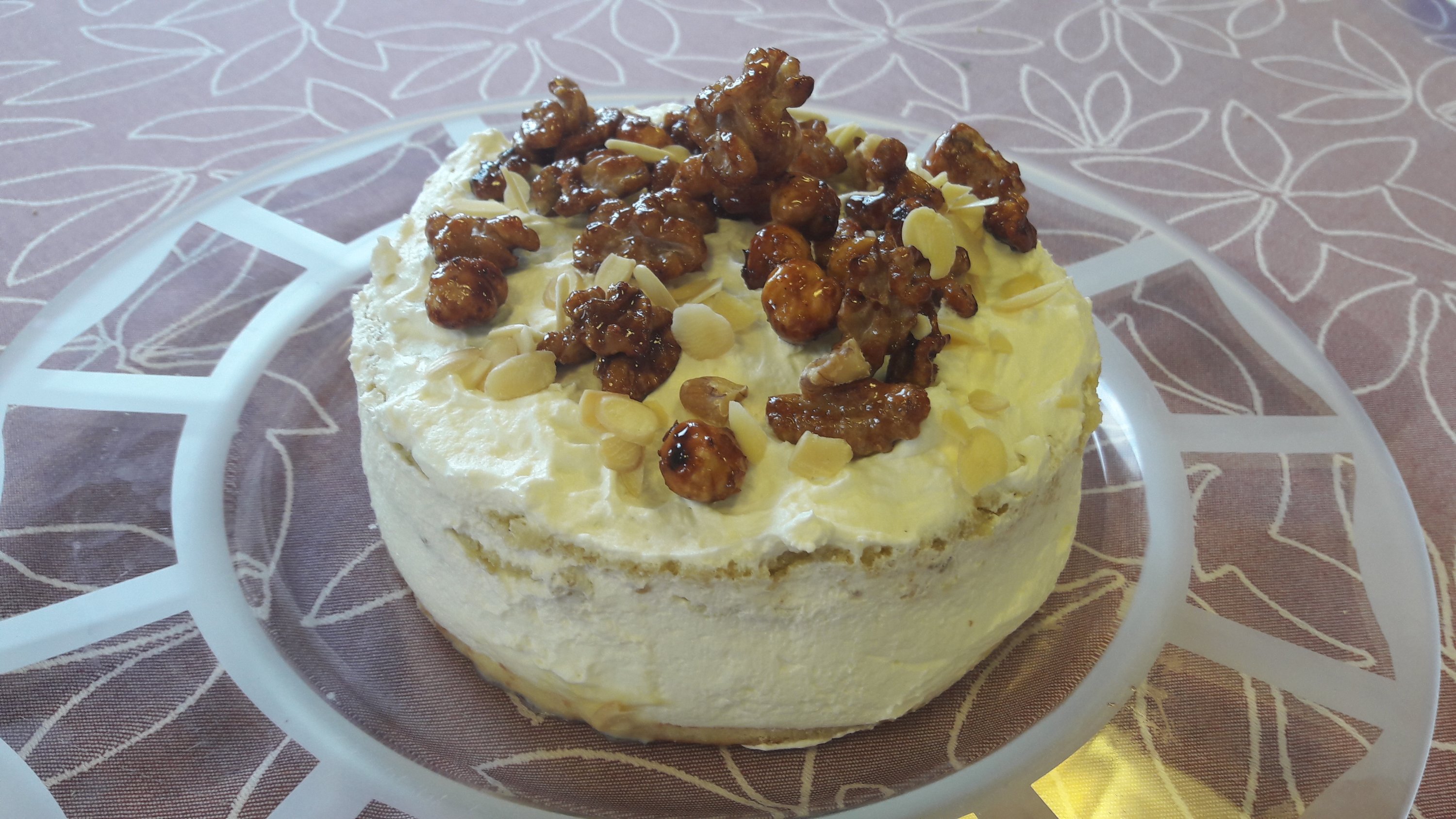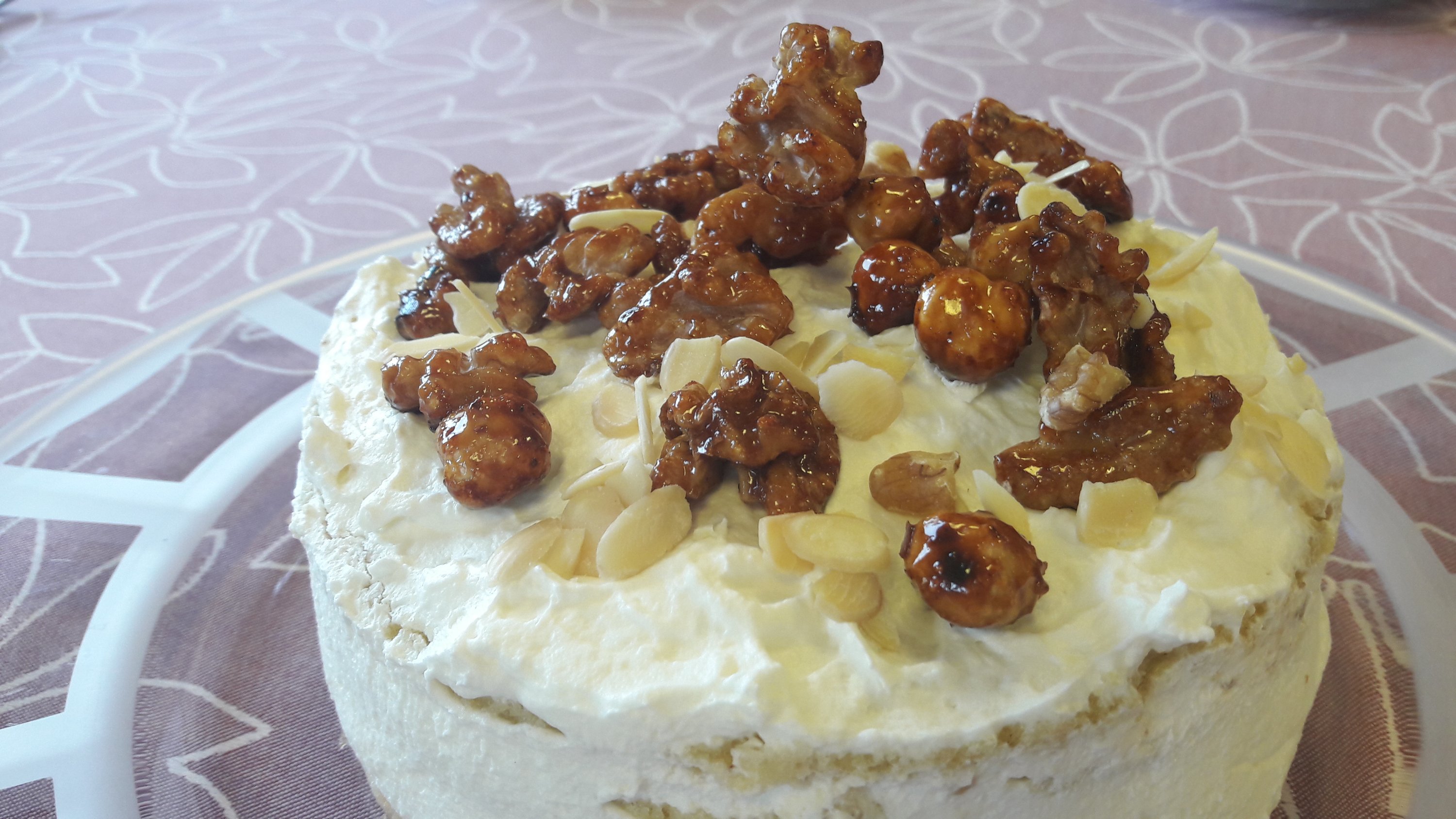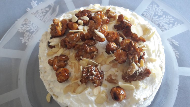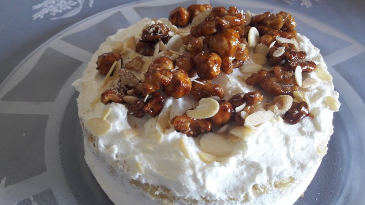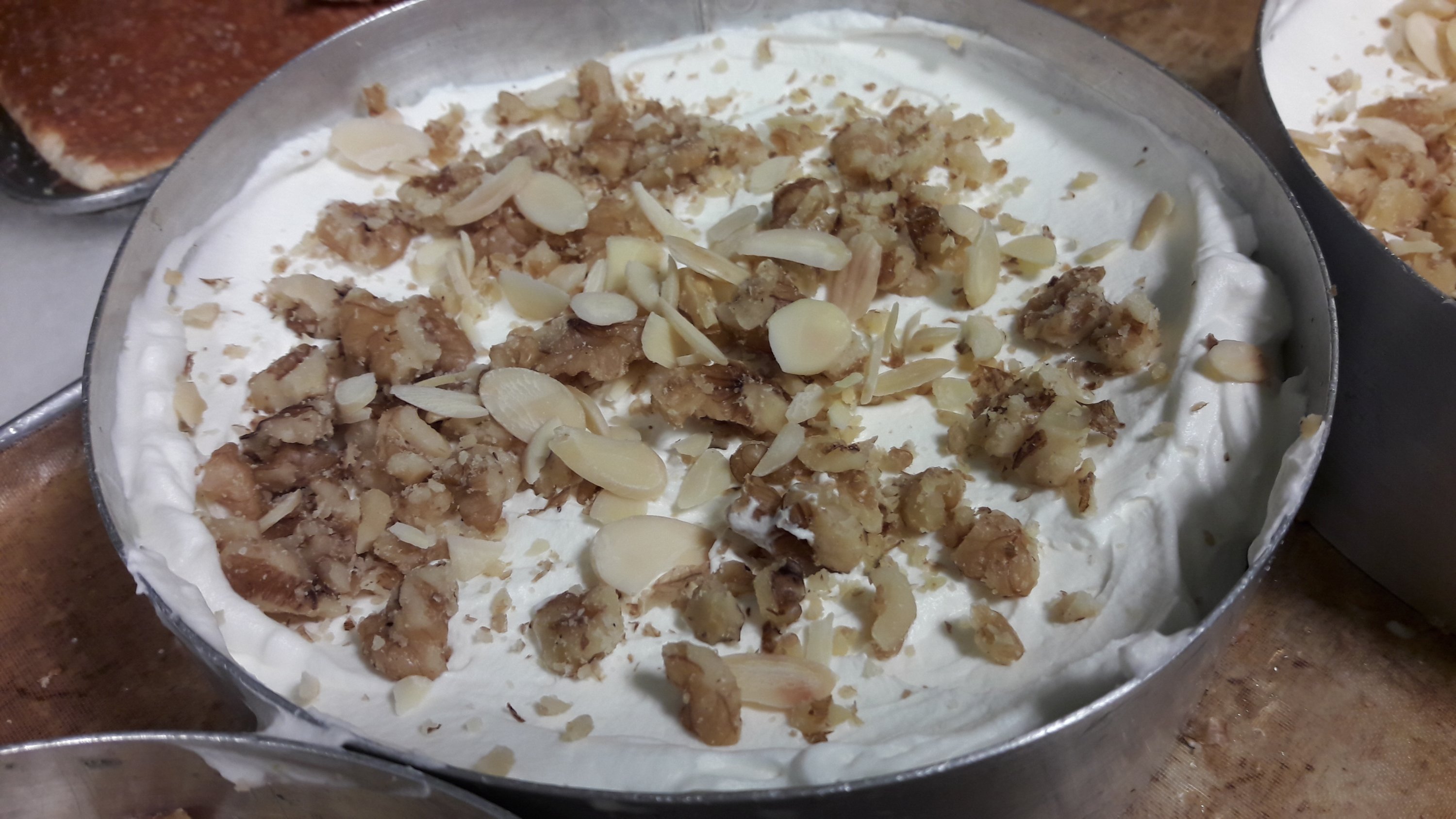 Sobre una plancha de bizcocho muy emborrachada con almíbar, poner una capa de nata y sobre esta poner frutos secos, poner otra plancha de bizcocho y volver a emborrachar.