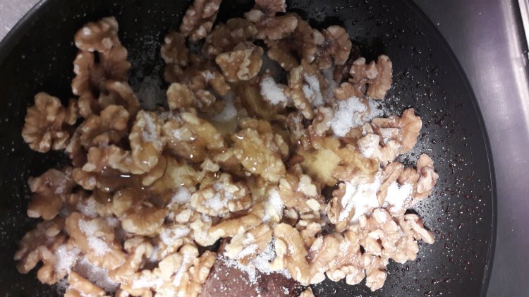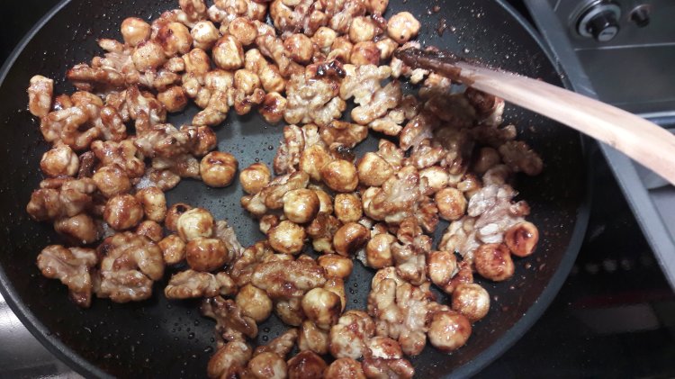 Pon a fuego medio todos los ingredientes y no dejes de mover en ningún momento hasta que veas que se han dorado y caramelizado los frutos secos.